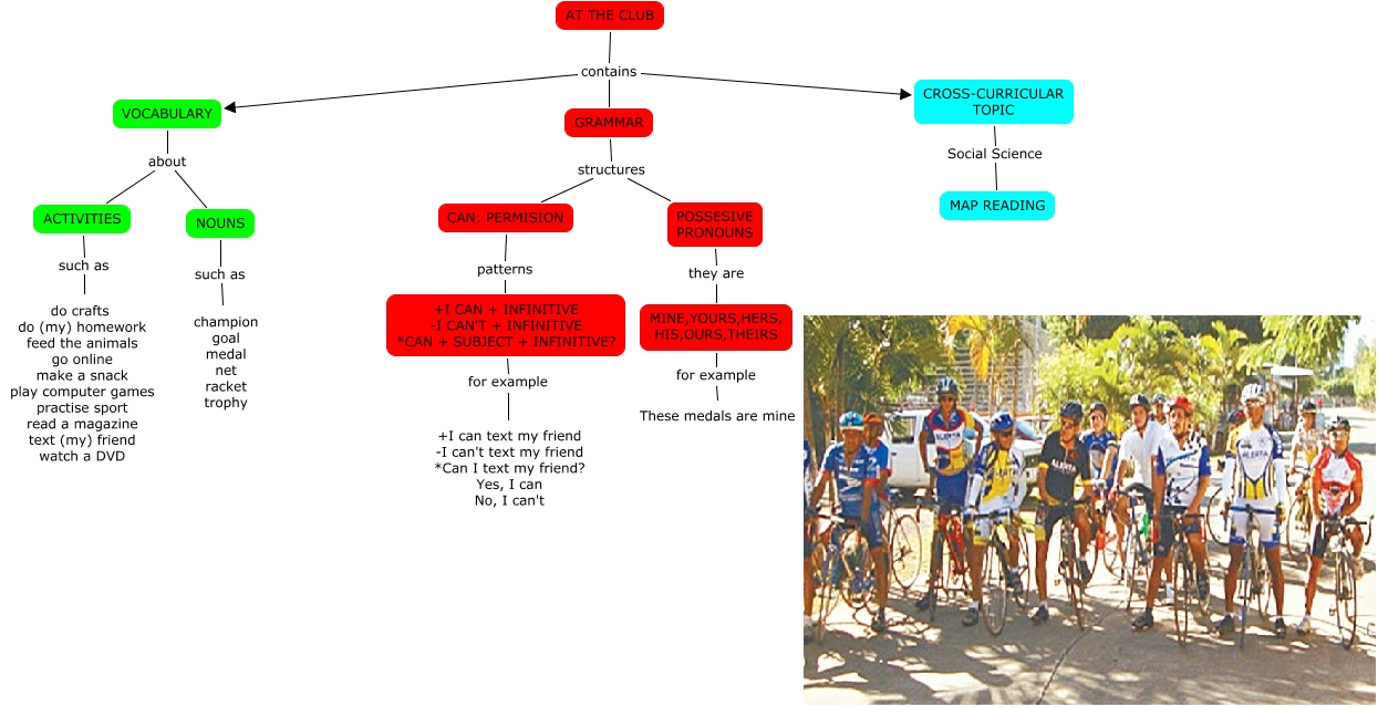 Este Cmap, tiene información relacionada con: AT THE CLUB (Joshua), VOCABULARY about ACTIVITIES, MINE,YOURS,HERS, HIS,OURS,THEIRS for example These medals are mine, POSSESIVE PRONOUNS they are MINE,YOURS,HERS, HIS,OURS,THEIRS, GRAMMAR structures CAN: PERMISION, NOUNS such as champion goal medal net racket trophy, AT THE CLUB contains GRAMMAR, +I CAN + INFINITIVE -I CAN'T + INFINITIVE *CAN + SUBJECT + INFINITIVE? for example +I can text my friend -I can't text my friend *Can I text my friend? Yes, I can No, I can't, CAN: PERMISION patterns +I CAN + INFINITIVE -I CAN'T + INFINITIVE *CAN + SUBJECT + INFINITIVE?, GRAMMAR structures POSSESIVE PRONOUNS, VOCABULARY about NOUNS, AT THE CLUB contains CROSS-CURRICULAR TOPIC, ACTIVITIES such as do crafts do (my) homework feed the animals go online make a snack play computer games practise sport read a magazine text (my) friend watch a DVD, CROSS-CURRICULAR TOPIC Social Science MAP READING, AT THE CLUB contains VOCABULARY