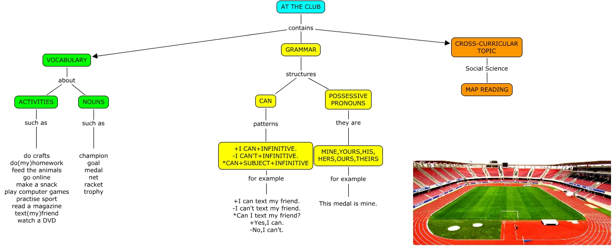 Este Cmap, tiene información relacionada con: AT THE CLUB-(JUAN MARTINA), +I CAN+INFINITIVE. -I CAN'T+INFINITIVE. *CAN+SUBJECT+INFINITIVE for example +I can text my friend. -I can't text my friend. *Can I text my friend? +Yes,I can. -No,I can't., GRAMMAR structures CAN, CROSS-CURRICULAR TOPIC Social Science MAP READING, VOCABULARY about ACTIVITIES, GRAMMAR structures POSSESSIVE PRONOUNS, CAN patterns +I CAN+INFINITIVE. -I CAN'T+INFINITIVE. *CAN+SUBJECT+INFINITIVE, MINE,YOURS,HIS, HERS,OURS,THEIRS for example This medal is mine., AT THE CLUB contains CROSS-CURRICULAR TOPIC, POSSESSIVE PRONOUNS they are MINE,YOURS,HIS, HERS,OURS,THEIRS, ACTIVITIES such as do crafts do(my)homework feed the animals go online make a snack play computer games practise sport read a magazine text(my)friend watch a DVD, AT THE CLUB contains VOCABULARY, AT THE CLUB contains GRAMMAR, NOUNS such as champion goal medal net racket trophy, VOCABULARY about NOUNS
