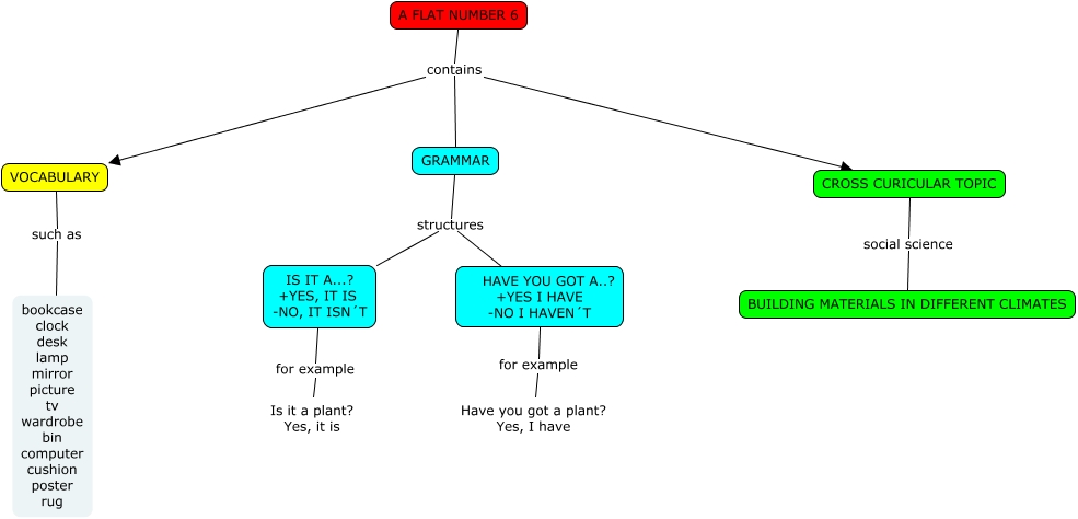 Este Cmap, tiene información relacionada con: A FLAT NUMBER 6 ( Lucas y David), CROSS CURICULAR TOPIC social science BUILDING MATERIALS IN DIFFERENT CLIMATES, GRAMMAR structures HAVE YOU GOT A..? +YES I HAVE -NO I HAVEN´T, A FLAT NUMBER 6 contains CROSS CURICULAR TOPIC, GRAMMAR structures IS IT A...? +YES, IT IS -NO, IT ISN´T, VOCABULARY such as bookcase clock desk lamp mirror picture tv wardrobe bin computer cushion poster rug, HAVE YOU GOT A..? +YES I HAVE -NO I HAVEN´T for example Have you got a plant? Yes, I have, A FLAT NUMBER 6 contains GRAMMAR, A FLAT NUMBER 6 contains VOCABULARY, IS IT A...? +YES, IT IS -NO, IT ISN´T for example Is it a plant? Yes, it is
