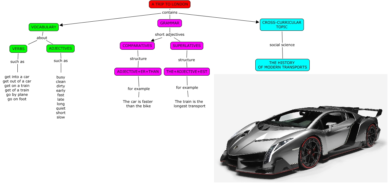 Este Cmap, tiene información relacionada con: A TRIP TO LONDON_JAIME Y YAGO, VOCABULARY about VERBS, ADJECTIVE+ER+THAN for example The car is faster than the bike, GRAMMAR short adjectives SUPERLATIVES, A TRIP TO LONDON contains VOCABULARY, GRAMMAR short adjectives COMPARATIVES, CROSS-CURRICULAR TOPIC social science THE HISTORY OF MODERN TRANSPORTS, SUPERLATIVES structure THE+ADJECTIVE+EST, VERBS such as get into a car get out of a car get on a train get of a train go by plane go on foot, VOCABULARY about ADJECTIVES, ADJECTIVES such as busy clean dirty early fast late long quiet short slow, A TRIP TO LONDON contains CROSS-CURRICULAR TOPIC, A TRIP TO LONDON contains GRAMMAR, THE+ADJECTIVE+EST for example The train is the longest transport, COMPARATIVES structure ADJECTIVE+ER+THAN