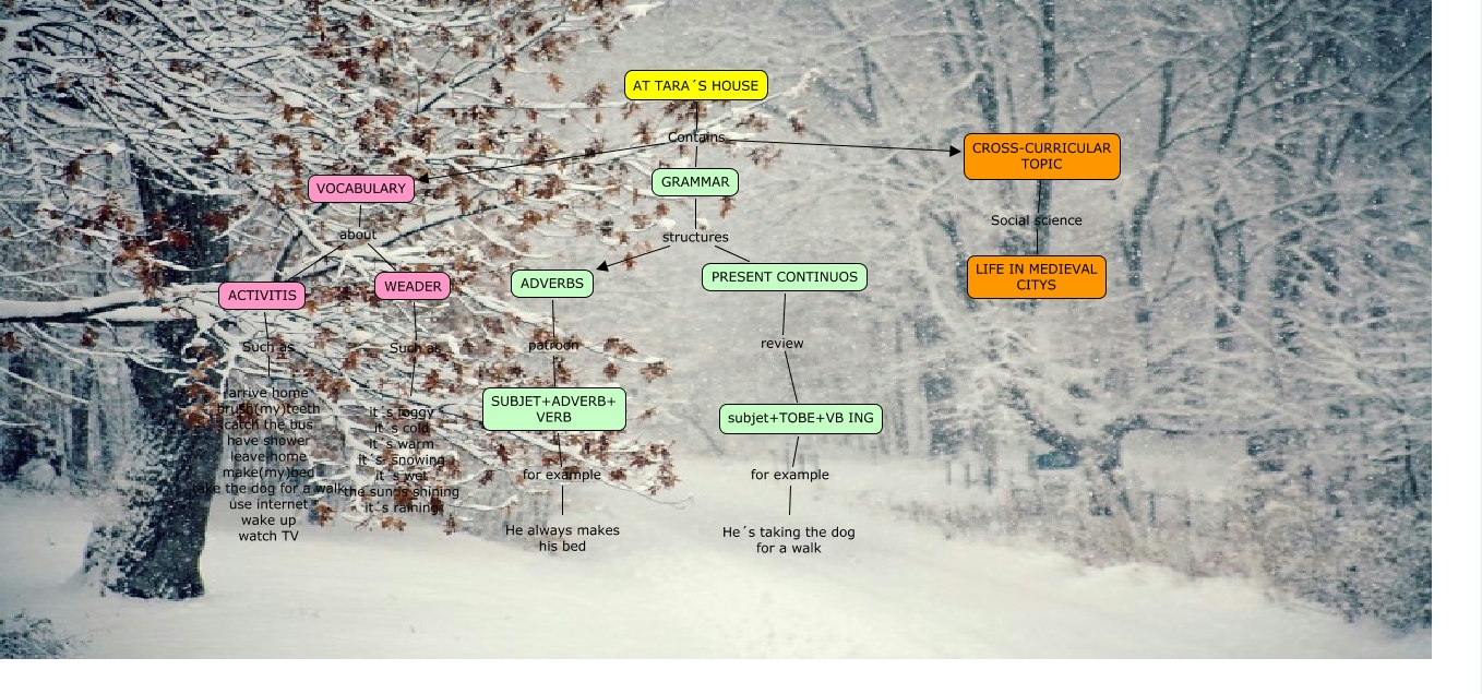 Este Cmap, tiene información relacionada con: AT TARA´S HOUSE-ALEJANDRA Y ARIADNA, PRESENT CONTINUOS review subjet+TOBE+VB ING, subjet+TOBE+VB ING for example He´s taking the dog for a walk, GRAMMAR structures ADVERBS, AT TARA´S HOUSE Contains CROSS-CURRICULAR TOPIC, VOCABULARY about ACTIVITIS, AT TARA´S HOUSE Contains GRAMMAR, CROSS-CURRICULAR TOPIC Social science LIFE IN MEDIEVAL CITYS, ADVERBS patroon SUBJET+ADVERB+ VERB, AT TARA´S HOUSE Contains VOCABULARY, ACTIVITIS Such as arrive home brush(my)teeth catch the bus have shower leave home make(my)bed take the dog for a walk use internet wake up watch TV, GRAMMAR structures PRESENT CONTINUOS, SUBJET+ADVERB+ VERB for example He always makes his bed, VOCABULARY about WEADER, WEADER Such as it´s foggy it´s cold it´s warm it´s snowing it´s wet the sun is shining it´s raining