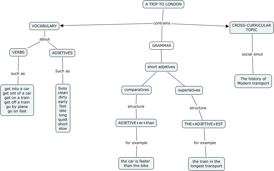 Este Cmap, tiene información relacionada con: A TRIP TO LONDON-2-ARIADNA, A TRIP TO LONDON contrains VOCABULARY, short adjetives ???? comparatives, THE+ADJETIVE+EST for example the train in the longest transport, VERBS such as get into a car get ont of a car get on a train get off a train go by plane go on fast, VOCABULARY about ADJETIVES, short adjetives ???? superlatives, comparatives structure ADJETIVE+er+than, A TRIP TO LONDON contrains CROSS-CURRICULAR TOPIC, VOCABULARY about VERBS, ADJETIVE+er+than for example the car is faster than the bike, CROSS-CURRICULAR TOPIC social since The history of Modern transport, ADJETIVES Such as busy clean dirty early fast late long quiet short slow, A TRIP TO LONDON contrains GRAMMAR, GRAMMAR ???? short adjetives, superlatives structure THE+ADJETIVE+EST