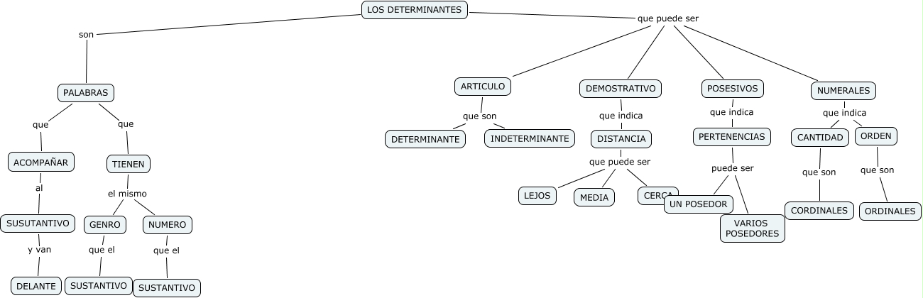 Este Cmap, tiene información relacionada con: LOS DETERMINANTES (Sergio Baez), ORDEN que son ORDINALES, ARTICULO que son INDETERMINANTE, DISTANCIA que puede ser LEJOS, PERTENENCIAS puede ser VARIOS POSEDORES, POSESIVOS que indica PERTENENCIAS, NUMERO que el SUSTANTIVO, LOS DETERMINANTES que puede ser ARTICULO, SUSUTANTIVO y van DELANTE, LOS DETERMINANTES que puede ser POSESIVOS, DISTANCIA que puede ser MEDIA, PERTENENCIAS puede ser UN POSEDOR, ARTICULO que son DETERMINANTE, DISTANCIA que puede ser CERCA, LOS DETERMINANTES son PALABRAS, PALABRAS que TIENEN, LOS DETERMINANTES que puede ser NUMERALES, ACOMPAÑAR al SUSUTANTIVO, PALABRAS que ACOMPAÑAR, TIENEN el mismo NUMERO, CANTIDAD que son CORDINALES