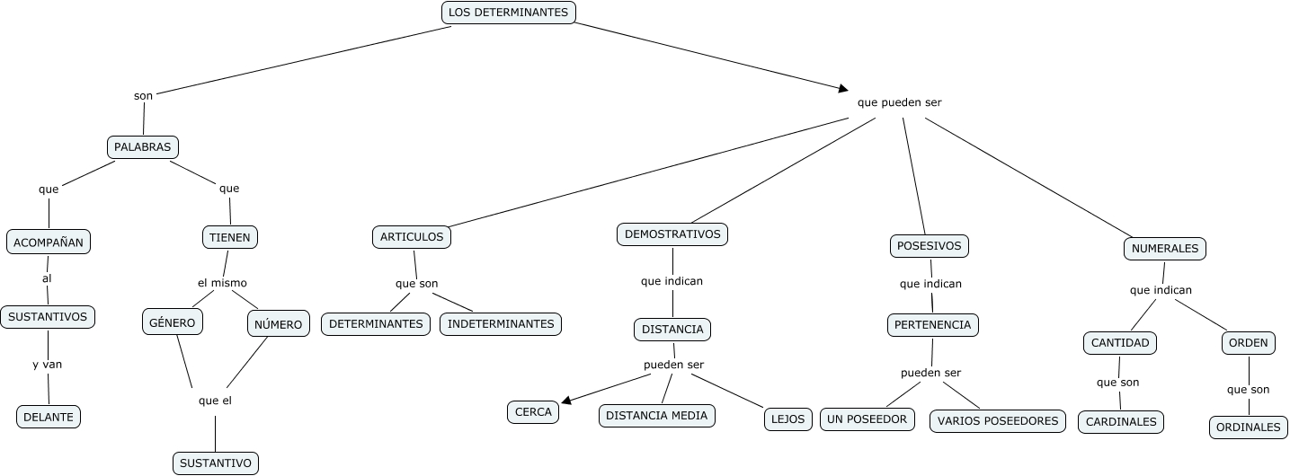 Este Cmap, tiene información relacionada con: LOS DETERMINANTES-Isabel, PALABRAS que TIENEN, TIENEN el mismo NÚMERO, PERTENENCIA pueden ser VARIOS POSEEDORES, NUMERALES que indican CANTIDAD, DISTANCIA pueden ser DISTANCIA MEDIA, GÉNERO ???? que el, ARTICULOS que son DETERMINANTES, CANTIDAD que son CARDINALES, POSESIVOS que indican PERTENENCIA, que pueden ser ???? NUMERALES, que pueden ser ???? DEMOSTRATIVOS, ACOMPAÑAN al SUSTANTIVOS, DEMOSTRATIVOS que indican DISTANCIA, que pueden ser ???? ARTICULOS, que pueden ser ???? POSESIVOS, que el ???? SUSTANTIVO, ORDEN que son ORDINALES, NUMERALES que indican ORDEN, LOS DETERMINANTES ???? que pueden ser, LOS DETERMINANTES son PALABRAS