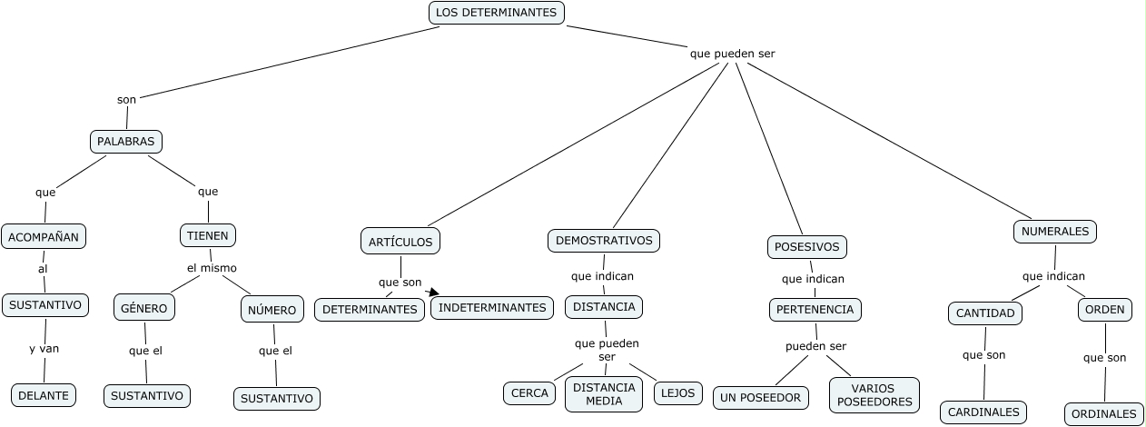 Este Cmap, tiene información relacionada con: LOS DETERMINANTES (Sara), TIENEN el mismo NÚMERO, ORDEN que son ORDINALES, NUMERALES que indican ORDEN, DISTANCIA que pueden ser CERCA, PALABRAS que ACOMPAÑAN, SUSTANTIVO y van DELANTE, TIENEN el mismo GÉNERO, PERTENENCIA pueden ser UN POSEEDOR, POSESIVOS que indican PERTENENCIA, DEMOSTRATIVOS que indican DISTANCIA, ACOMPAÑAN al SUSTANTIVO, ARTÍCULOS que son DETERMINANTES, DISTANCIA que pueden ser DISTANCIA MEDIA, DISTANCIA que pueden ser LEJOS, CANTIDAD que son CARDINALES, PALABRAS que TIENEN, NUMERALES que indican CANTIDAD, LOS DETERMINANTES son PALABRAS, LOS DETERMINANTES que pueden ser DEMOSTRATIVOS, LOS DETERMINANTES que pueden ser ARTÍCULOS