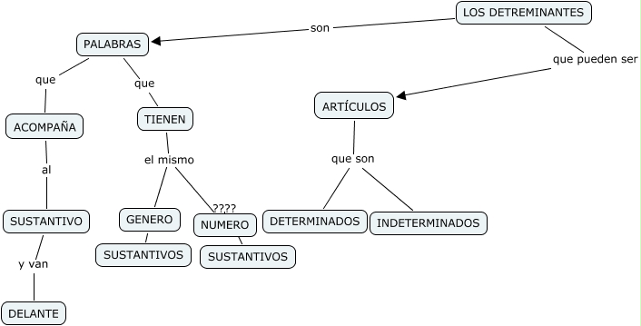 Este Cmap, tiene información relacionada con: LOS DETERMINANTES_(Anthony), LOS DETREMINANTES que pueden ser ARTÍCULOS, TIENEN el mismo GENERO, ARTÍCULOS que son INDETERMINADOS, ARTÍCULOS que son DETERMINADOS, TIENEN el mismo NUMERO, PALABRAS que ACOMPAÑA, PALABRAS que TIENEN, GENERO ???? SUSTANTIVOS, SUSTANTIVO y van DELANTE, ACOMPAÑA al SUSTANTIVO, NUMERO ???? SUSTANTIVOS, LOS DETREMINANTES son PALABRAS