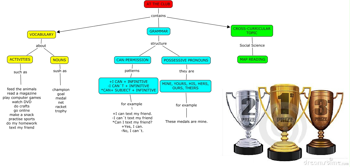 Este Cmap, tiene información relacionada con: AT THE CLUB-(Lucas), CAN:PERMISSION patterns +I CAN + INFINITIVE -I CAN`T + INFINITIVE *CAN+ SUBJECT + INFINITIVE, ACTIVITIES such as feed the animals read a magazine play computer games watch DVD do crafts go online make a snack practise sports do my homework text my friend, AT THE CLUB contains CROSS-CURRICULAR TOPIC, VOCABULARY about ACTIVITIES, AT THE CLUB contains VOCABULARY, MINE, YOURS, HIS, HERS, OURS, THEIRS for example These medals are mine., VOCABULARY about NOUNS, GRAMMAR structure POSSESSIVE PRONOUNS, NOUNS sush as champion goal medal net racket trophy, AT THE CLUB contains GRAMMAR, GRAMMAR structure CAN:PERMISSION, +I CAN + INFINITIVE -I CAN`T + INFINITIVE *CAN+ SUBJECT + INFINITIVE for example +I can text my friend. -I can´t text my friend *Can I text my friend? +Yes, I can. -No, I can´t., CROSS-CURRICULAR TOPIC Social Science MAP READING, POSSESSIVE PRONOUNS they are MINE, YOURS, HIS, HERS, OURS, THEIRS