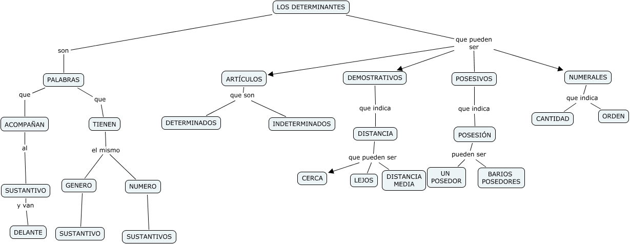 Este Cmap, tiene información relacionada con: LOS DETERMINANTES(Alejandra), NUMERALES que indica CANTIDAD, ARTÍCULOS que son INDETERMINADOS, ARTÍCULOS que son DETERMINADOS, GENERO ???? SUSTANTIVO, LOS DETERMINANTES que pueden ser NUMERALES, NUMERALES que indica ORDEN, NUMERO ???? SUSTANTIVOS, SUSTANTIVO y van DELANTE, POSESIVOS que indica POSESIÓN, ACOMPAÑAN al SUSTANTIVO, LOS DETERMINANTES que pueden ser DEMOSTRATIVOS, POSESIÓN pueden ser UN POSEDOR, LOS DETERMINANTES son PALABRAS, LOS DETERMINANTES que pueden ser POSESIVOS, LOS DETERMINANTES que pueden ser ARTÍCULOS, DEMOSTRATIVOS que indica DISTANCIA, DISTANCIA que pueden ser DISTANCIA MEDIA, PALABRAS que ACOMPAÑAN, TIENEN el mismo NUMERO, TIENEN el mismo GENERO