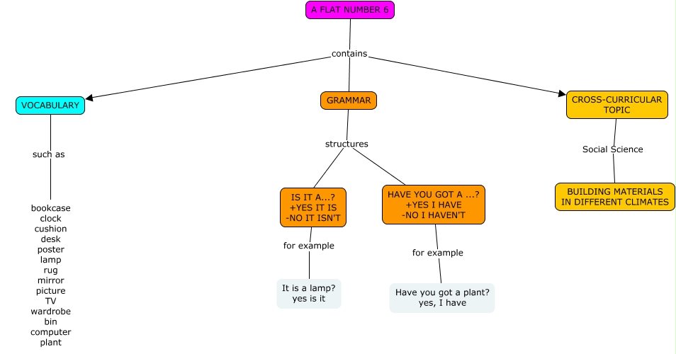 Este Cmap, tiene información relacionada con: AT FLAT NUMBER 6 (Arantxa, María J y Carmen B), VOCABULARY such as bookcase clock cushion desk poster lamp rug mirror picture TV wardrobe bin computer plant, IS IT A...? +YES IT IS -NO IT ISN'T for example It is a lamp? yes is it, A FLAT NUMBER 6 contains CROSS-CURRICULAR TOPIC, HAVE YOU GOT A ...? +YES I HAVE -NO I HAVEN'T for example Have you got a plant? yes, I have, GRAMMAR structures HAVE YOU GOT A ...? +YES I HAVE -NO I HAVEN'T, A FLAT NUMBER 6 contains GRAMMAR, CROSS-CURRICULAR TOPIC Social Science BUILDING MATERIALS IN DIFFERENT CLIMATES, A FLAT NUMBER 6 contains VOCABULARY, GRAMMAR structures IS IT A...? +YES IT IS -NO IT ISN'T