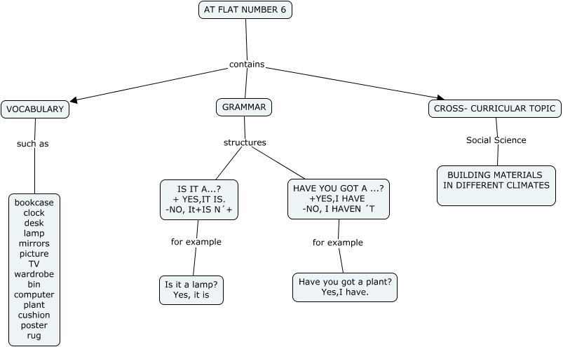 Este Cmap, tiene información relacionada con: AT FLAT NUMBER 6 (Nicole y Juan Antonio), CROSS- CURRICULAR TOPIC Social Science BUILDING MATERIALS IN DIFFERENT CLIMATES, IS IT A...? + YES,IT IS. -NO, It+IS N´+ for example Is it a lamp? Yes, it is, AT FLAT NUMBER 6 contains GRAMMAR, AT FLAT NUMBER 6 contains VOCABULARY, GRAMMAR structures HAVE YOU GOT A ...? +YES,I HAVE -NO, I HAVEN ´T, VOCABULARY such as bookcase clock desk lamp mirrors picture TV wardrobe bin computer plant cushion poster rug, GRAMMAR structures IS IT A...? + YES,IT IS. -NO, It+IS N´+, AT FLAT NUMBER 6 contains CROSS- CURRICULAR TOPIC, HAVE YOU GOT A ...? +YES,I HAVE -NO, I HAVEN ´T for example Have you got a plant? Yes,I have.