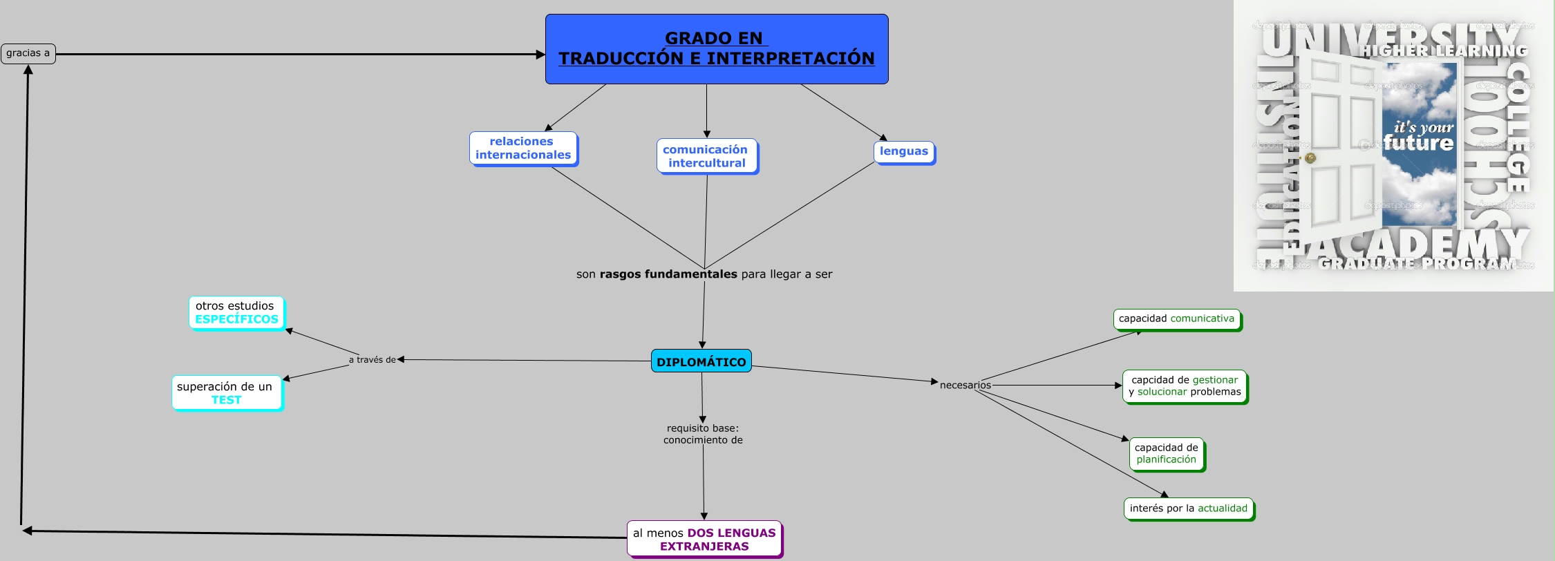Questa Cmap, creata con IHMC CmapTools, contiene informazioni relative a: baseconocimientosALI, DIPLOMÁTICO necesarios capcidad de gestionar y solucionar problemas, DIPLOMÁTICO necesarios capacidad de planificación, al menos DOS LENGUAS EXTRANJERAS gracias a, DIPLOMÁTICO a través de superación de un TEST, DIPLOMÁTICO necesarios interés por la actualidad, GRADO EN TRADUCCIÓN E INTERPRETACIÓN ???? relaciones internacionales, GRADO EN TRADUCCIÓN E INTERPRETACIÓN ???? lenguas, DIPLOMÁTICO requisito base: conocimiento de al menos DOS LENGUAS EXTRANJERAS, relaciones internacionales son rasgos fundamentales para llegar a ser lenguas, relaciones internacionales son rasgos fundamentales para llegar a ser DIPLOMÁTICO, DIPLOMÁTICO necesarios capacidad comunicativa, DIPLOMÁTICO a través de otros estudios ESPECÍFICOS, gracias a ???? GRADO EN TRADUCCIÓN E INTERPRETACIÓN, GRADO EN TRADUCCIÓN E INTERPRETACIÓN ???? comunicación intercultural, relaciones internacionales son rasgos fundamentales para llegar a ser comunicación intercultural
