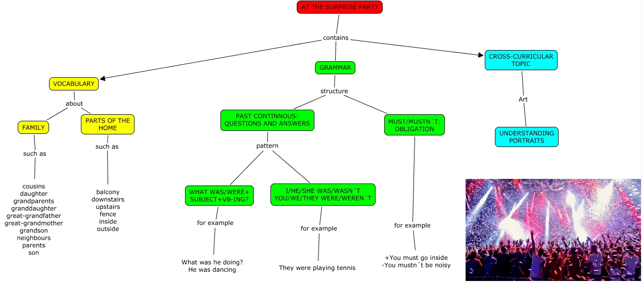 Este Cmap, tiene información relacionada con: AT THE SURPRISE PARTY(Ángel y David), CROSS-CURRICULAR TOPIC Art UNDERSTANDING PORTRAITS, FAMILY such as cousins daughter grandparents granddaughter great-grandfather great-grandmother grandson neighbours parents son, PARTS OF THE HOME such as balcony downstairs upstairs fence inside outside, VOCABULARY about FAMILY, WHAT WAS/WERE+ SUBJECT+VB-ING? for example What was he doing? He was dancing, AT THE SURPRISE PARTY contains GRAMMAR, GRAMMAR structure MUST/MUSTN´T: OBLIGATION, PAST CONTINNOUS: QUESTIONS AND ANSWERS pattern I/HE/SHE WAS/WASN´T YOU/WE/THEY WERE/WEREN´T, PAST CONTINNOUS: QUESTIONS AND ANSWERS pattern WHAT WAS/WERE+ SUBJECT+VB-ING?, AT THE SURPRISE PARTY contains VOCABULARY, GRAMMAR structure PAST CONTINNOUS: QUESTIONS AND ANSWERS, MUST/MUSTN´T: OBLIGATION for example +You must go inside -You mustn´t be noisy, AT THE SURPRISE PARTY contains CROSS-CURRICULAR TOPIC, VOCABULARY about PARTS OF THE HOME, I/HE/SHE WAS/WASN´T YOU/WE/THEY WERE/WEREN´T for example They were playing tennis