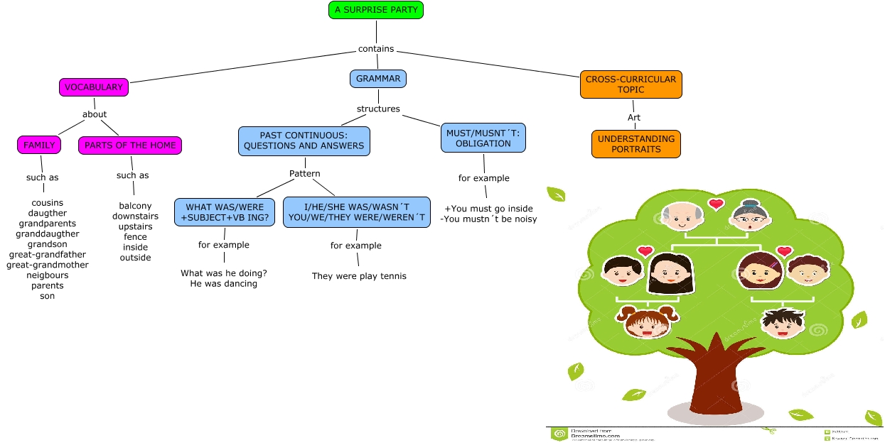 Este Cmap, tiene información relacionada con: AT THE SURPRISE PARTY-Lucas, VOCABULARY about PARTS OF THE HOME, FAMILY such as cousins daugther grandparents granddaugther grandson great-grandfather great-grandmother neigbours parents son, CROSS-CURRICULAR TOPIC Art UNDERSTANDING PORTRAITS, A SURPRISE PARTY contains VOCABULARY, VOCABULARY about FAMILY, PAST CONTINUOUS: QUESTIONS AND ANSWERS Pattern I/HE/SHE WAS/WASN´T YOU/WE/THEY WERE/WEREN´T, GRAMMAR structures MUST/MUSNT´T: OBLIGATION, WHAT WAS/WERE +SUBJECT+VB ING? for example What was he doing? He was dancing, MUST/MUSNT´T: OBLIGATION for example +You must go inside -You mustn´t be noisy, PARTS OF THE HOME such as balcony downstairs upstairs fence inside outside, I/HE/SHE WAS/WASN´T YOU/WE/THEY WERE/WEREN´T for example They were play tennis, GRAMMAR structures PAST CONTINUOUS: QUESTIONS AND ANSWERS, PAST CONTINUOUS: QUESTIONS AND ANSWERS Pattern WHAT WAS/WERE +SUBJECT+VB ING?, A SURPRISE PARTY contains GRAMMAR, A SURPRISE PARTY contains CROSS-CURRICULAR TOPIC