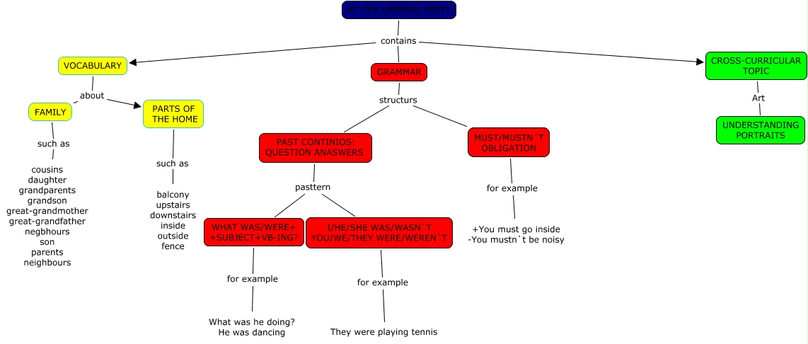 Este Cmap, tiene información relacionada con: AT THE SURPRISE PARTY(Germán y Derek), PAST CONTINIOS: QUESTION ANASWERS pasttern WHAT WAS/WERE+ +SUBJECT+VB-ING?, VOCABULARY about FAMILY, PARTS OF THE HOME such as balcony upstairs downstairs inside outside fence, PAST CONTINIOS: QUESTION ANASWERS pasttern I/HE/SHE WAS/WASN`T YOU/WE/THEY WERE/WEREN`T, AT THE URPRAIS PARTY contains CROSS-CURRICULAR TOPIC, MUST/MUSTN´T OBLIGATION for example +You must go inside -You mustn`t be noisy, WHAT WAS/WERE+ +SUBJECT+VB-ING? for example What was he doing? He was dancing, GRAMMAR structurs PAST CONTINIOS: QUESTION ANASWERS, AT THE URPRAIS PARTY contains GRAMMAR, I/HE/SHE WAS/WASN`T YOU/WE/THEY WERE/WEREN`T for example They were playing tennis, CROSS-CURRICULAR TOPIC Art UNDERSTANDING PORTRAITS, GRAMMAR structurs MUST/MUSTN´T OBLIGATION, AT THE URPRAIS PARTY contains VOCABULARY, FAMILY such as cousins daughter grandparents grandson great-grandmother great-grandfather negbhours son parents neighbours, VOCABULARY about PARTS OF THE HOME