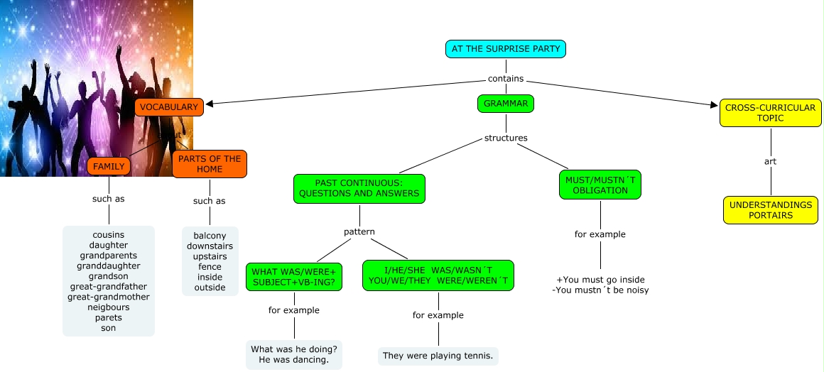 Este Cmap, tiene información relacionada con: AT THE SURPRISE-CARLOS DANIEL, VOCABULARY about PARTS OF THE HOME, PAST CONTINUOUS: QUESTIONS AND ANSWERS pattern I/HE/SHE WAS/WASN´T YOU/WE/THEY WERE/WEREN´T, FAMILY such as cousins daughter grandparents granddaughter grandson great-grandfather great-grandmother neigbours parets son, PARTS OF THE HOME such as balcony downstairs upstairs fence inside outside, AT THE SURPRISE PARTY contains VOCABULARY, GRAMMAR structures PAST CONTINUOUS: QUESTIONS AND ANSWERS, PAST CONTINUOUS: QUESTIONS AND ANSWERS pattern WHAT WAS/WERE+ SUBJECT+VB-ING?, MUST/MUSTN´T OBLIGATION for example +You must go inside -You mustn´t be noisy, CROSS-CURRICULAR TOPIC art UNDERSTANDINGS PORTAIRS, AT THE SURPRISE PARTY contains GRAMMAR, I/HE/SHE WAS/WASN´T YOU/WE/THEY WERE/WEREN´T for example They were playing tennis., AT THE SURPRISE PARTY contains CROSS-CURRICULAR TOPIC, GRAMMAR structures MUST/MUSTN´T OBLIGATION, VOCABULARY about FAMILY, WHAT WAS/WERE+ SUBJECT+VB-ING? for example What was he doing? He was dancing.