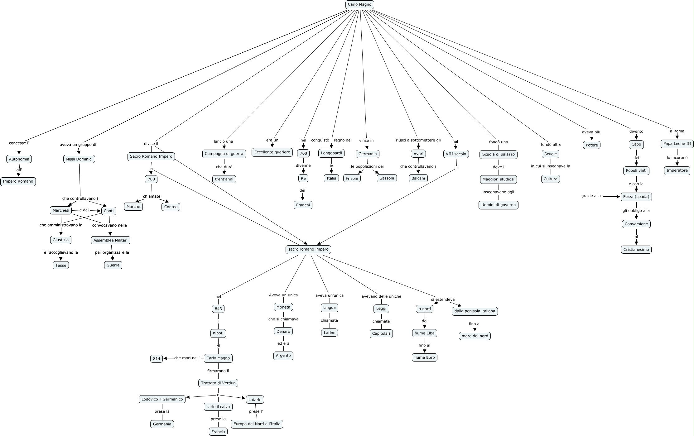 Questa Cmap, creata con IHMC CmapTools, contiene informazioni relative a: SINTESI Carlo Magno Castagner-Cescon, Giustizia e raccoglievano le Tasse, Campagna di guerra che durò trent'anni, 700 chiamate Contee, Scuole in cui si insegnava la Cultura, 768 divenne Re, 700 chiamate Marche, Marchesi e dai Conti, Trattato di Verdun e carlo il calvo, Trattato di Verdun e Lodovico il Germanico, 700 chiamate Contee, Denaro ed era Argento, Carlo Magno vinse in Germania, Potere grazie alla Forza (spada), Carlo Magno che morì nell' 814, Carlo Magno firmarono il Trattato di Verdun, Capo dei Popoli vinti, Autonomia all' Impero Romano, Marchesi che amministravano la Giustizia, sacro romano impero aveva un'unica Lingua, Missi Dominici che controllavano i Conti