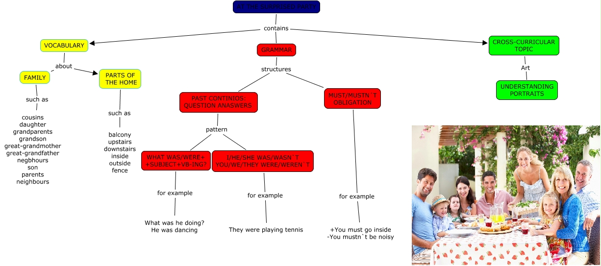 Este Cmap, tiene información relacionada con: AT THE SURPRISE PARTY Germán y Derek, I/HE/SHE WAS/WASN`T YOU/WE/THEY WERE/WEREN`T for example They were playing tennis, CROSS-CURRICULAR TOPIC Art UNDERSTANDING PORTRAITS, WHAT WAS/WERE+ +SUBJECT+VB-ING? for example What was he doing? He was dancing, AT THE SURPRISED PARTY contains CROSS-CURRICULAR TOPIC, GRAMMAR structures MUST/MUSTN´T OBLIGATION, MUST/MUSTN´T OBLIGATION for example +You must go inside -You mustn`t be noisy, AT THE SURPRISED PARTY contains GRAMMAR, AT THE SURPRISED PARTY contains VOCABULARY, VOCABULARY about PARTS OF THE HOME, PAST CONTINIOS: QUESTION ANASWERS pattern WHAT WAS/WERE+ +SUBJECT+VB-ING?, VOCABULARY about FAMILY, PARTS OF THE HOME such as balcony upstairs downstairs inside outside fence, PAST CONTINIOS: QUESTION ANASWERS pattern I/HE/SHE WAS/WASN`T YOU/WE/THEY WERE/WEREN`T, FAMILY such as cousins daughter grandparents grandson great-grandmother great-grandfather negbhours son parents neighbours, GRAMMAR structures PAST CONTINIOS: QUESTION ANASWERS