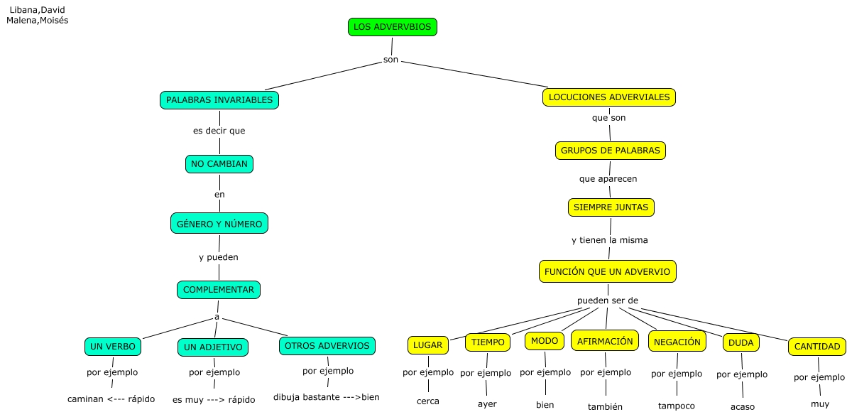 Este Cmap, tiene información relacionada con: ADVERBIOS-libana,malena,david y moisés, AFIRMACIÓN por ejemplo también, PALABRAS INVARIABLES es decir que NO CAMBIAN, LOS ADVERVBIOS son PALABRAS INVARIABLES, LUGAR por ejemplo cerca, UN ADJETIVO por ejemplo es muy ---> rápido, COMPLEMENTAR a OTROS ADVERVIOS, FUNCIÓN QUE UN ADVERVIO pueden ser de CANTIDAD, GRUPOS DE PALABRAS que aparecen SIEMPRE JUNTAS, NEGACIÓN por ejemplo tampoco, LOS ADVERVBIOS son LOCUCIONES ADVERVIALES, TIEMPO por ejemplo ayer, NO CAMBIAN en GÉNERO Y NÚMERO, UN VERBO por ejemplo caminan <--- rápido, FUNCIÓN QUE UN ADVERVIO pueden ser de TIEMPO, LOCUCIONES ADVERVIALES que son GRUPOS DE PALABRAS, MODO por ejemplo bien, FUNCIÓN QUE UN ADVERVIO pueden ser de AFIRMACIÓN, FUNCIÓN QUE UN ADVERVIO pueden ser de MODO, CANTIDAD por ejemplo muy, OTROS ADVERVIOS por ejemplo dibuja bastante --->bien