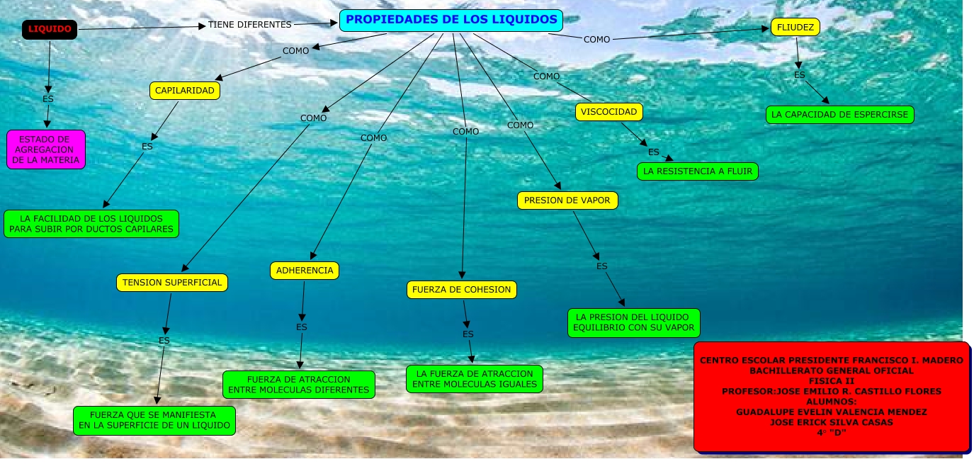 Este Cmap, tiene información relacionada con: EVELIN VALENCIA Y ERICK SILVA, FUERZA DE COHESION ES LA FUERZA DE ATRACCION ENTRE MOLECULAS IGUALES, TENSION SUPERFICIAL ES FUERZA QUE SE MANIFIESTA EN LA SUPERFICIE DE UN LIQUIDO, LIQUIDO TIENE DIFERENTES PROPIEDADES DE LOS LIQUIDOS, PROPIEDADES DE LOS LIQUIDOS COMO FLIUDEZ, FLIUDEZ ES LA CAPACIDAD DE ESPERCIRSE, VISCOCIDAD ES LA RESISTENCIA A FLUIR, PROPIEDADES DE LOS LIQUIDOS COMO PRESION DE VAPOR, PROPIEDADES DE LOS LIQUIDOS COMO CAPILARIDAD, LIQUIDO ES ESTADO DE AGREGACION DE LA MATERIA, PROPIEDADES DE LOS LIQUIDOS COMO FUERZA DE COHESION, CAPILARIDAD ES LA FACILIDAD DE LOS LIQUIDOS PARA SUBIR POR DUCTOS CAPILARES, PROPIEDADES DE LOS LIQUIDOS COMO TENSION SUPERFICIAL, PRESION DE VAPOR ES LA PRESION DEL LIQUIDO EQUILIBRIO CON SU VAPOR, PROPIEDADES DE LOS LIQUIDOS COMO VISCOCIDAD, PROPIEDADES DE LOS LIQUIDOS COMO ADHERENCIA, ADHERENCIA ES FUERZA DE ATRACCION ENTRE MOLECULAS DIFERENTES