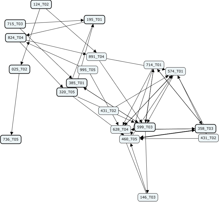 This Concept Map, created with IHMC CmapTools, has information related to: cohort 5 with id numbers, 460_T05 358_T03, 320_T05 460_T05, 358_T03 460_T05, 358_T03 628_T04, 195_T01 320_T05, 599_T03 714_T01, 385_T01 195_T01, 358_T03 460_T05, 599_T03 146_T03, 628_T04 358_T03, 574_T01 431_T02, 574_T01 628_T04, 358_T03 714_T01, 574_T01 599_T03, 431_T02 574_T01, 715_T03 195_T01, 385_T01 599_T03, 431_T02 460_T05, 025_T02 736_T05, 714_T01 599_T03