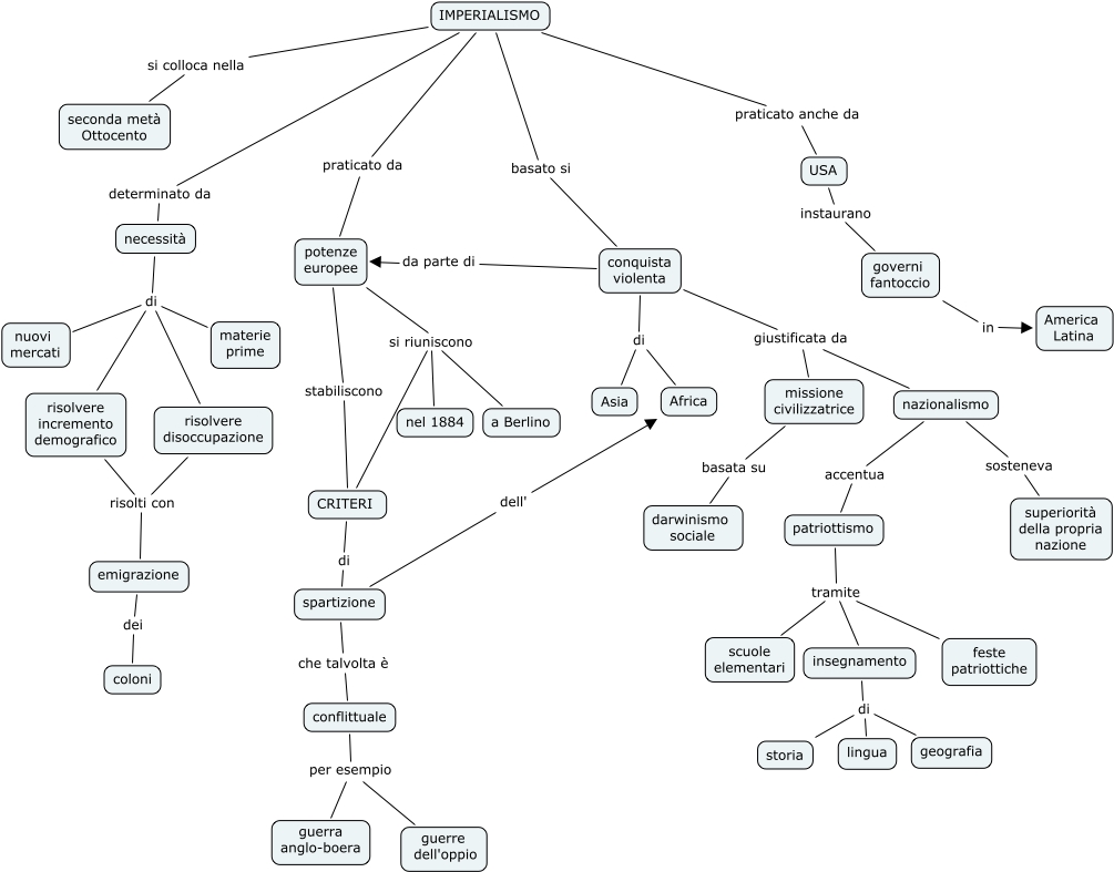 Questa Cmap, creata con IHMC CmapTools, contiene informazioni relative a: IMPERIALISMO, potenze europee si riuniscono CRITERI, patriottismo tramite feste patriottiche, CRITERI di spartizione, IMPERIALISMO si colloca nella seconda metà Ottocento, conquista violenta da parte di potenze europee, IMPERIALISMO determinato da necessità, insegnamento di storia, conquista violenta giustificata da missione civilizzatrice, necessità di nuovi mercati, necessità di materie prime, risolvere incremento demografico risolti con emigrazione, missione civilizzatrice basata su darwinismo sociale, necessità di risolvere disoccupazione, emigrazione dei coloni, spartizione che talvolta è conflittuale, nazionalismo accentua patriottismo, USA instaurano governi fantoccio, insegnamento di lingua, conflittuale per esempio guerre dell'oppio, necessità di risolvere incremento demografico