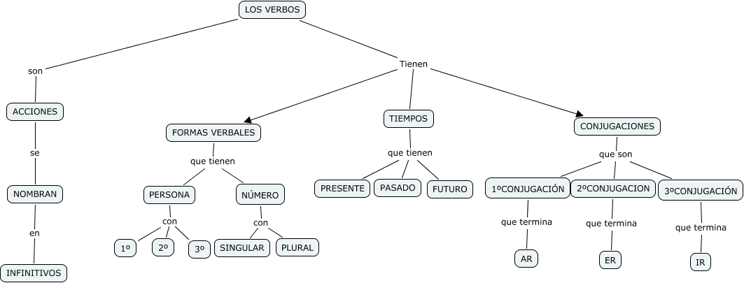 Este Cmap, tiene información relacionada con: LOS VERBOS-Samuel, LOS VERBOS Tienen TIEMPOS, ACCIONES se NOMBRAN, 1ºCONJUGACIÓN que termina AR, LOS VERBOS Tienen FORMAS VERBALES, 3ºCONJUGACIÓN que termina IR, TIEMPOS que tienen PASADO, PERSONA con 2º, FORMAS VERBALES que tienen NÚMERO, PERSONA con 1º, LOS VERBOS Tienen CONJUGACIONES, 2ºCONJUGACION que termina ER, CONJUGACIONES que son 3ºCONJUGACIÓN, CONJUGACIONES que son 2ºCONJUGACION, LOS VERBOS son ACCIONES, FORMAS VERBALES que tienen PERSONA, TIEMPOS que tienen FUTURO, CONJUGACIONES que son 1ºCONJUGACIÓN, NOMBRAN en INFINITIVOS, TIEMPOS que tienen PRESENTE, NÚMERO con PLURAL