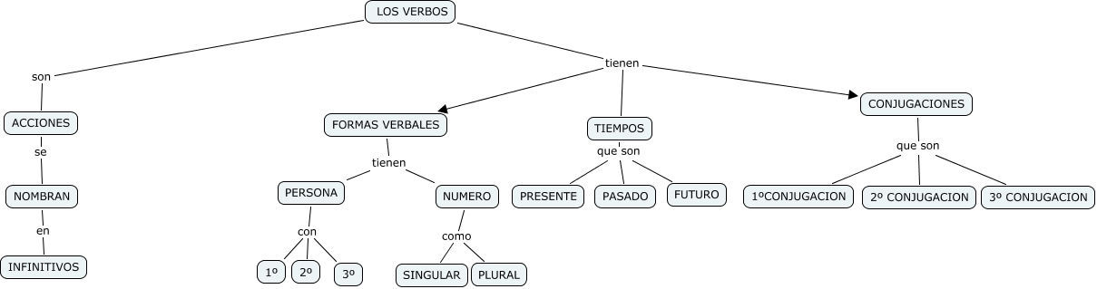 Este Cmap, tiene información relacionada con: LOS VERBOS -(Alejandra), NUMERO como PLURAL, CONJUGACIONES que son 1ºCONJUGACION, PERSONA con 3º, PERSONA con 2º, LOS VERBOS tienen FORMAS VERBALES, LOS VERBOS son ACCIONES, TIEMPOS que son FUTURO, CONJUGACIONES que son 2º CONJUGACION, FORMAS VERBALES tienen NUMERO, TIEMPOS que son PASADO, LOS VERBOS tienen CONJUGACIONES, NUMERO como SINGULAR, FORMAS VERBALES tienen PERSONA, CONJUGACIONES que son 3º CONJUGACION, LOS VERBOS tienen TIEMPOS, TIEMPOS que son PRESENTE, NOMBRAN en INFINITIVOS, ACCIONES se NOMBRAN, PERSONA con 1º