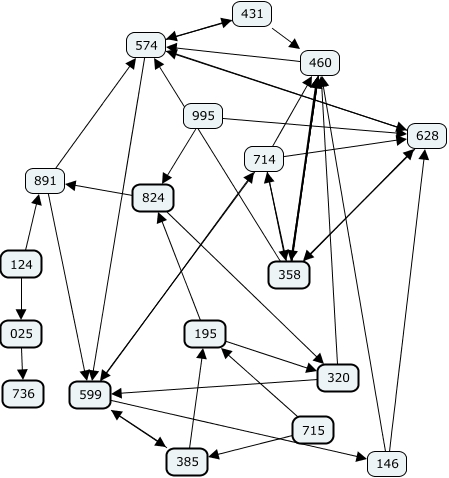 This Concept Map, created with IHMC CmapTools, has information related to: cohort 5 with id numbers and not many lines crossed no teams, 320 460, 358 460, 460 358, 358 628, 195 320, 599 714, 385 195, 358 460, 599 146, 628 358, 574 431, 574 628, 358 714, 574 599, 715 195, 385 599, 431 460, 025 736, 714 599, 124 025