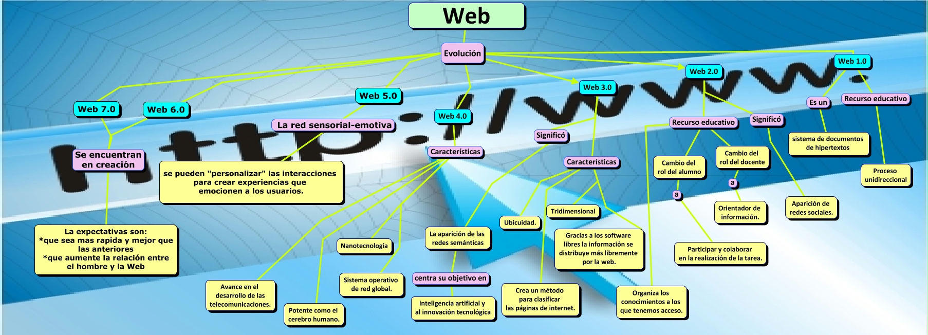 Este Cmap, tiene información relacionada con: web2.0, Web Evolución Web 6.0, Web 1.0 Es un sistema de documentos de hipertextos, Web 5.0 La red sensorial-emotiva se pueden "personalizar" las interacciones para crear experiencias que emocionen a los usuarios., Web 2.0 Recurso educativo Cambio del rol del alumno, Web 5.0 Evolución Web 6.0, Web 6.0 Se encuentran en creación La expectativas son: *que sea mas rapida y mejor que las anteriores *que aumente la relación entre el hombre y la Web, Web 5.0 Evolución Web 1.0, Web 3.0 Características Ubicuidad., La aparición de las redes semánticas centra su objetivo en inteligencia artificial y al innovación tecnológica, Web 3.0 Significó La aparición de las redes semánticas, Web 4.0 Características Nanotecnología, Web 7.0 Evolución Web 2.0, Web 7.0 Evolución Web 1.0, Web Evolución Web 3.0, Cambio del rol del alumno a Participar y colaborar en la realización de la tarea., Web 7.0 Evolución Web 6.0, Web 5.0 Evolución Web 2.0, Web 7.0 Evolución Web 3.0, Web 2.0 Significó Aparición de redes sociales., Web 4.0 Características Sistema operativo de red global.