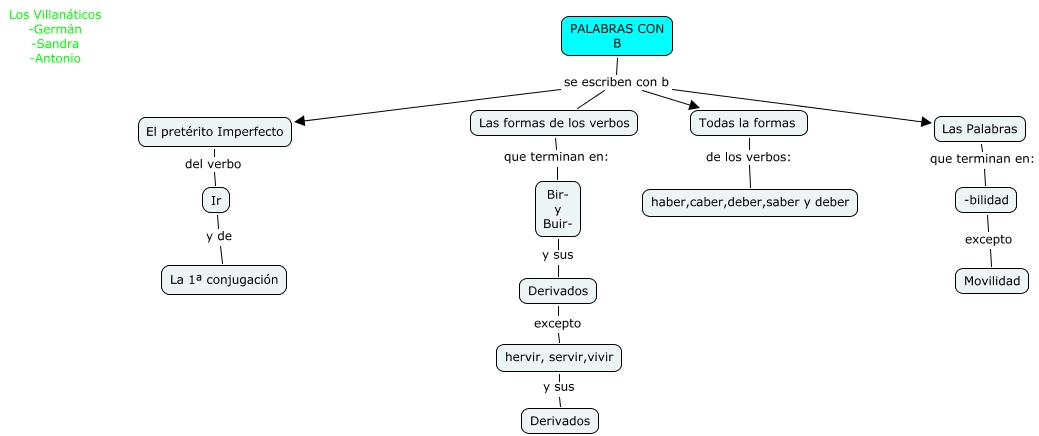 Este Cmap, tiene información relacionada con: PALABRAS CON B -Germán-Sandra y Antonio, El pretérito Imperfecto del verbo Ir, PALABRAS CON B se escriben con b El pretérito Imperfecto, PALABRAS CON B se escriben con b Las Palabras, Todas la formas de los verbos: haber,caber,deber,saber y deber, PALABRAS CON B se escriben con b Todas la formas, -bilidad excepto Movilidad, Derivados excepto hervir, servir,vivir, Bir- y Buir- y sus Derivados, Las formas de los verbos que terminan en: Bir- y Buir-, Ir y de La 1ª conjugación, hervir, servir,vivir y sus Derivados, Las Palabras que terminan en: -bilidad, PALABRAS CON B se escriben con b Las formas de los verbos