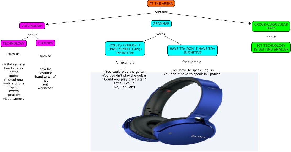 Este Cmap, tiene información relacionada con: AT THE ARENA-IRENE Y DANIEL, COULD/ COULDN´T ( PAST SIMPLE CAN)+ INFINITIVE for example +You could play the guitar -You couldn't play the guitar *Could you play the guitar? +Yes ,I could -No, I couldn't, GRAMMAR verbs COULD/ COULDN´T ( PAST SIMPLE CAN)+ INFINITIVE, TECHNOLOGY such as digital camera headphones laptop ligths microphone mobile phone projector screen speakers video camera, AT THE ARENA contains GRAMMAR, CROOS-CURRICULAR TOPIC about ICT.TECHNOLOGY IS GETTING SMALLER, VOCABULARY about CLOTHES, CLOTHES such as bow tie costume handkerchief hat suit waistcoat, HAVE TO/ DON´T HAVE TO+ INFINITIVE for example +You have to speak English -You don`t have to speak in Spanish, VOCABULARY about TECHNOLOGY, AT THE ARENA contains CROOS-CURRICULAR TOPIC, AT THE ARENA contains VOCABULARY, GRAMMAR verbs HAVE TO/ DON´T HAVE TO+ INFINITIVE
