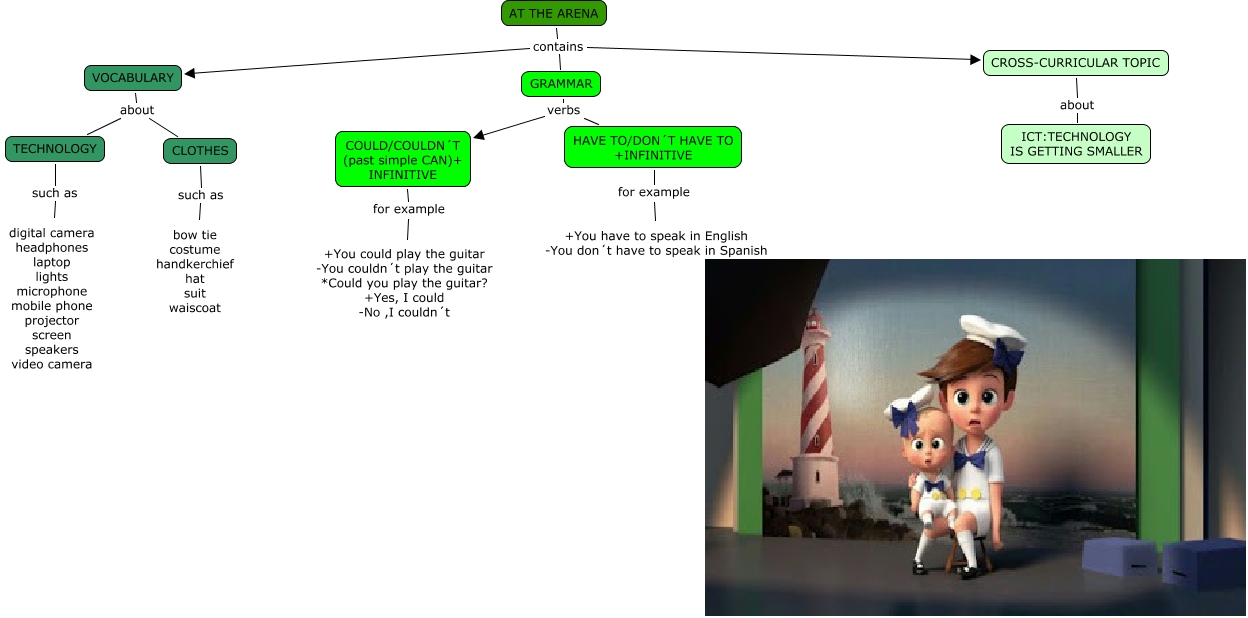 Este Cmap, tiene información relacionada con: AT THE ARENA-AMIRA Y CARMEN, CROSS-CURRICULAR TOPIC about ICT:TECHNOLOGY IS GETTING SMALLER, COULD/COULDN´T (past simple CAN)+ INFINITIVE for example +You could play the guitar -You couldn´t play the guitar *Could you play the guitar? +Yes, I could -No ,I couldn´t, GRAMMAR verbs HAVE TO/DON´T HAVE TO +INFINITIVE, VOCABULARY about TECHNOLOGY, VOCABULARY about CLOTHES, GRAMMAR verbs COULD/COULDN´T (past simple CAN)+ INFINITIVE, AT THE ARENA contains CROSS-CURRICULAR TOPIC, HAVE TO/DON´T HAVE TO +INFINITIVE for example +You have to speak in English -You don´t have to speak in Spanish, TECHNOLOGY such as digital camera headphones laptop lights microphone mobile phone projector screen speakers video camera, AT THE ARENA contains VOCABULARY, AT THE ARENA contains GRAMMAR, CLOTHES such as bow tie costume handkerchief hat suit waiscoat