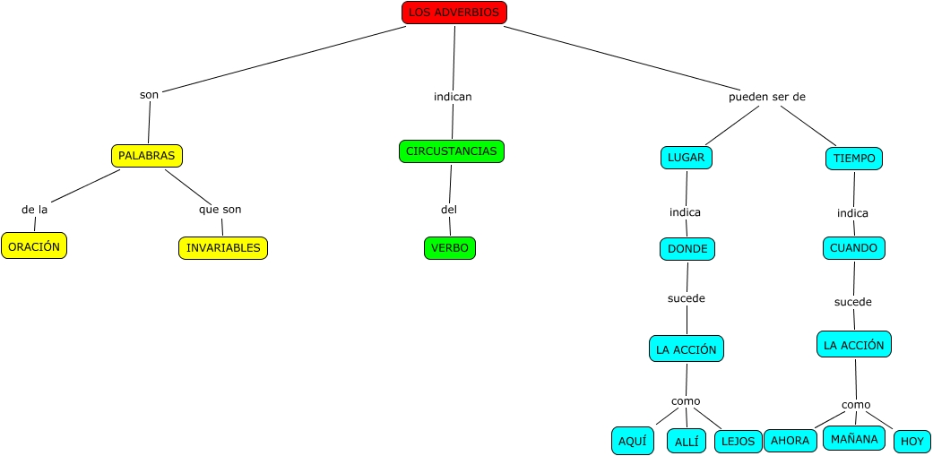 Este Cmap, tiene información relacionada con: LOS ADVERBIOS-Daniel G, PALABRAS que son INVARIABLES, LA ACCIÓN como LEJOS, CUANDO sucede LA ACCIÓN, LOS ADVERBIOS pueden ser de TIEMPO, DONDE sucede LA ACCIÓN, LOS ADVERBIOS indican CIRCUSTANCIAS, PALABRAS de la ORACIÓN, TIEMPO indica CUANDO, LA ACCIÓN como AQUÍ, LA ACCIÓN como MAÑANA, LUGAR indica DONDE, LA ACCIÓN como ALLÍ, LOS ADVERBIOS pueden ser de LUGAR, LA ACCIÓN como HOY, LA ACCIÓN como AHORA, LOS ADVERBIOS son PALABRAS, CIRCUSTANCIAS del VERBO