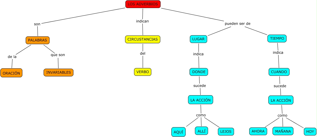 Este Cmap, tiene información relacionada con: LOS ADVERBIOS-Inés, CUANDO sucede LA ACCIÓN, LOS ADVERBIOS indican CIRCUSTANCIAS, LA ACCIÓN como ALLÍ, DONDE sucede LA ACCIÓN, LUGAR indica DONDE, LOS ADVERBIOS son PALABRAS, CIRCUSTANCIAS del VERBO, PALABRAS de la ORACIÓN, LOS ADVERBIOS pueden ser de TIEMPO, LA ACCIÓN como HOY, LA ACCIÓN como AHORA, LA ACCIÓN como LEJOS, LA ACCIÓN como AQUÍ, LA ACCIÓN como MAÑANA, TIEMPO indica CUANDO, LOS ADVERBIOS pueden ser de LUGAR, PALABRAS que son INVARIABLES