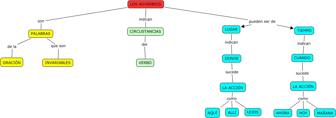 Este Cmap, tiene información relacionada con: LOS ADVERBIOS-Isabel, DONDE sucede LA ACCIÓN, LA ACCIÓN como AQUÍ, LA ACCIÓN como ALLÍ, LOS ADVERBIOS son PALABRAS, LA ACCIÓN como LEJOS, TIEMPO indican CUANDO, LOS ADVERBIOS pueden ser de LUGAR, LOS ADVERBIOS indican CIRCUSTANCIAS, LA ACCIÓN como MAÑANA, LUGAR indican DONDE, CIRCUSTANCIAS del VERBO, PALABRAS que son INVARIABLES, PALABRAS de la ORACIÓN, LA ACCIÓN como HOY, LA ACCIÓN como AHORA, LOS ADVERBIOS pueden ser de TIEMPO, CUANDO sucede LA ACCIÓN