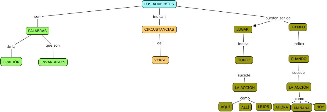 Este Cmap, tiene información relacionada con: LOS ADVERBIOS - Noelia, PALABRAS que son INVARIABLES, TIEMPO indica CUANDO, LA ACCIÓN como MAÑANA, LA ACCIÓN como AQUÍ, LOS ADVERBIOS pueden ser de LUGAR, LA ACCIÓN como LEJOS, LOS ADVERBIOS pueden ser de TIEMPO, CIRCUSTANCIAS del VERBO, LA ACCIÓN como AHORA, LOS ADVERBIOS son PALABRAS, DONDE sucede LA ACCIÓN, CUANDO sucede LA ACCIÓN, LA ACCIÓN como HOY, LUGAR indica DONDE, PALABRAS de la ORACIÓN, LOS ADVERBIOS indican CIRCUSTANCIAS, LA ACCIÓN como ALLÍ