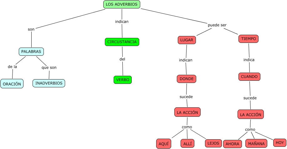 Este Cmap, tiene información relacionada con: LOS ADVERBIOS-Guillermo Fukai, LA ACCIÓN como LEJOS, PALABRAS de la ORACIÓN, CIRCUSTANCIA del VERBO, DONDE sucede LA ACCIÓN, LOS ADVERBIOS son PALABRAS, LA ACCIÓN como AHORA, LOS ADVERBIOS indican CIRCUSTANCIA, CUANDO sucede LA ACCIÓN, TIEMPO indica CUANDO, LA ACCIÓN como ALLÍ, LA ACCIÓN como AQUÍ, LA ACCIÓN como MAÑANA, LA ACCIÓN como HOY, PALABRAS que son INADVERBIOS, LOS ADVERBIOS puede ser TIEMPO, LUGAR indican DONDE, LOS ADVERBIOS puede ser LUGAR