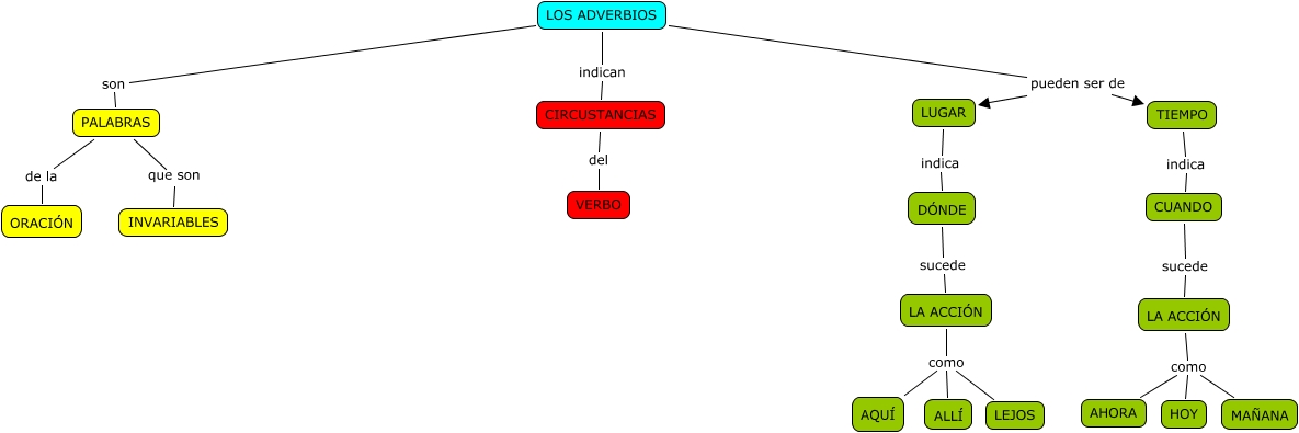 Este Cmap, tiene información relacionada con: LOS ADVERBIOS-(Andrea), LA ACCIÓN como ALLÍ, LA ACCIÓN como MAÑANA, LA ACCIÓN como LEJOS, LOS ADVERBIOS indican CIRCUSTANCIAS, LA ACCIÓN como AHORA, DÓNDE sucede LA ACCIÓN, LOS ADVERBIOS pueden ser de TIEMPO, LUGAR indica DÓNDE, CUANDO sucede LA ACCIÓN, PALABRAS de la ORACIÓN, PALABRAS que son INVARIABLES, TIEMPO indica CUANDO, LA ACCIÓN como AQUÍ, LOS ADVERBIOS son PALABRAS, CIRCUSTANCIAS del VERBO, LA ACCIÓN como HOY, LOS ADVERBIOS pueden ser de LUGAR