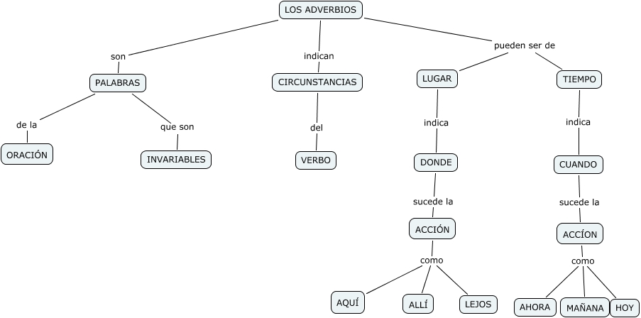 Este Cmap, tiene información relacionada con: LOS ADVERBIOS-Samuel, PALABRAS de la ORACIÓN, LOS ADVERBIOS pueden ser de TIEMPO, ACCIÓN como AQUÍ, ACCÍON como HOY, PALABRAS que son INVARIABLES, ACCÍON como AHORA, TIEMPO indica CUANDO, LOS ADVERBIOS pueden ser de LUGAR, CIRCUNSTANCIAS del VERBO, LUGAR indica DONDE, ACCÍON como MAÑANA, DONDE sucede la ACCIÓN, LOS ADVERBIOS indican CIRCUNSTANCIAS, CUANDO sucede la ACCÍON, ACCIÓN como LEJOS, LOS ADVERBIOS son PALABRAS, ACCIÓN como ALLÍ