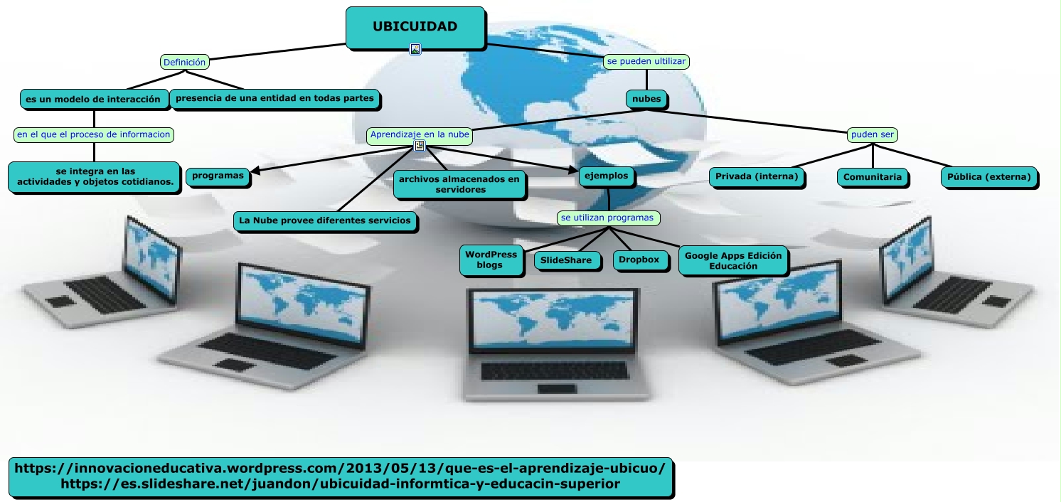 Este Cmap, tiene información relacionada con: Ubicuidad, nubes puden ser Comunitaria, ejemplos se utilizan programas WordPress blogs, nubes Aprendizaje en la nube ejemplos, nubes Aprendizaje en la nube programas, nubes puden ser Pública (externa), es un modelo de interacción en el que el proceso de informacion se integra en las actividades y objetos cotidianos., nubes puden ser Privada (interna), UBICUIDAD se pueden ultilizar nubes, nubes Aprendizaje en la nube La Nube provee diferentes servicios, UBICUIDAD Definición es un modelo de interacción, ejemplos se utilizan programas SlideShare, ejemplos se utilizan programas Dropbox, UBICUIDAD Definición presencia de una entidad en todas partes, nubes Aprendizaje en la nube archivos almacenados en servidores, ejemplos se utilizan programas Google Apps Edición Educación