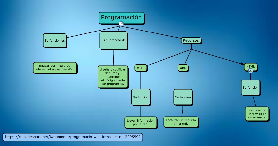 Este Cmap, tiene información relacionada con: programación, URL Su función Localizar un recurso en la red., Programación Recursos URL, HTML Su función Representa información almacenada., Programación Recursos HTTP, Programación Su función es Enlazar por medio de intervínculos páginas Web, Programación Es el proceso de diseñar, codificar depurar y mantener el código fuente de programas., Programación Recursos HTML, HTTP Su función Llevar información por la red.