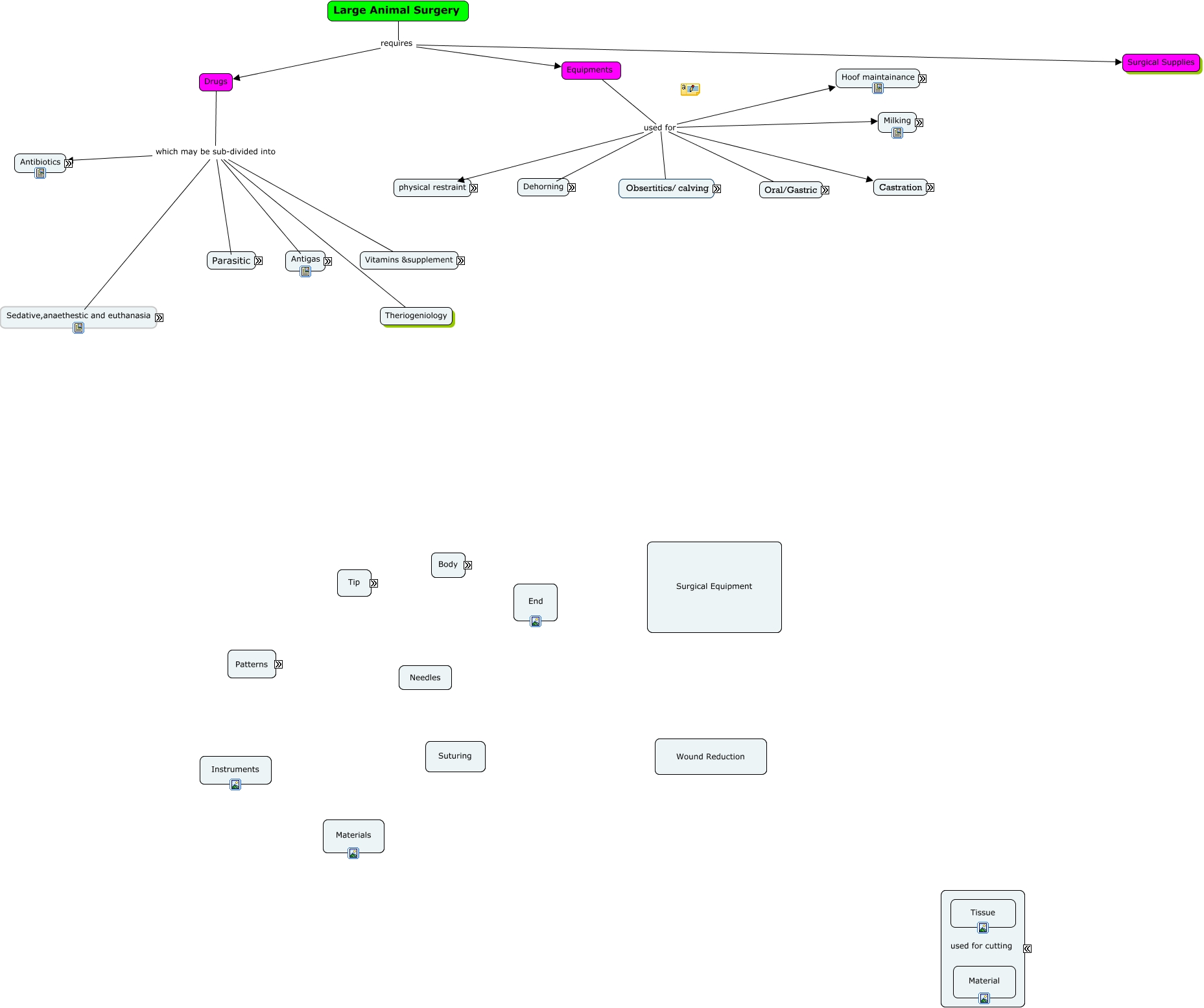 This Concept Map, created with IHMC CmapTools, has information related to: LAB1 LAS, HOOF MAINTAINACE consist cow clogs, Sedative,anaestheitc and Euthanizing includes Thiopental, Large Animal Surgery requires Equipments, Reproduction for mating such as Ram mating harness, Drugs which may be sub-divided into Antigas, Physical restraint employ the use of electric prods, Endoparasitic include Equitak, Dehorning manual Barnes Dehorner, Sedative,anaestheitc and Euthanizing includes Sodium pentobarbitone, Reproduction for pulling calf such as cattle head snare, Parasitic divided into Ectoparasitic, Equipments used for Oral/Gastric, Equipments used for Obsertitics/ calving, Physical restraint employ the use of ropes, HOOF MAINTAINACE consist hoof tester, Ectoparasitic includes Imizol, oral/gastric intruments such as Stomach pump and hose, Reproduction for pulling calf such as calving chains and hooks, Castration Burdizzo, Drugs which may be sub-divided into Antibiotics