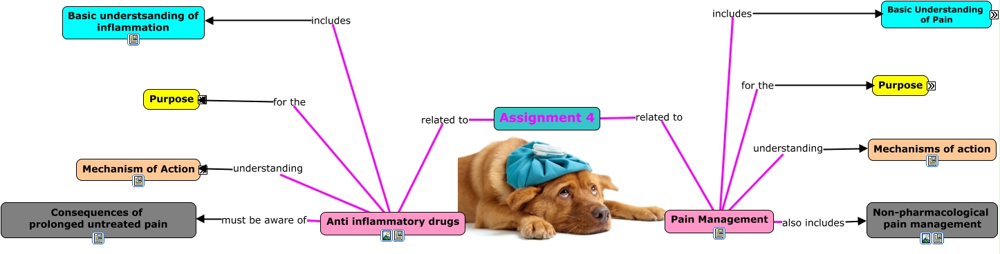 This Concept Map, created with IHMC CmapTools, has information related to: ANTI INFLAMMATORY DRUGS AND PAIN MEDICATION, Pain Management understanding Mechanisms of action, 5 Freedoms of welfare which are the freedom from discomfort, Medical includes Legal implications, Medical includes ethical reasons, Basic understanding of pain including How is pain assessed?, Pain Management includes Basic understanding of pain, mechanism of action including Long term use and safety, 5 Freedoms of welfare which are the freedom to express normal behaviour, mechanism of action including Adverse side effects, Purpose used as Anti-inflammatory, Medical includes Health benefits, Purpose used as Anti-pyretics, Pain Management for the Animal Welfare, Anti inflammatory drugs understanding mechanism of action, Anti inflammatory drugs must be aware of Consequences of prolonged untreated pain, Pain Management for the Medical, Health benefits like faster recovery, Animal Welfare to satisfy the 5 Freedoms of welfare, mechanism of action including Interactions with other drugs, 5 Freedoms of welfare which are the freedom from pain injury or disease