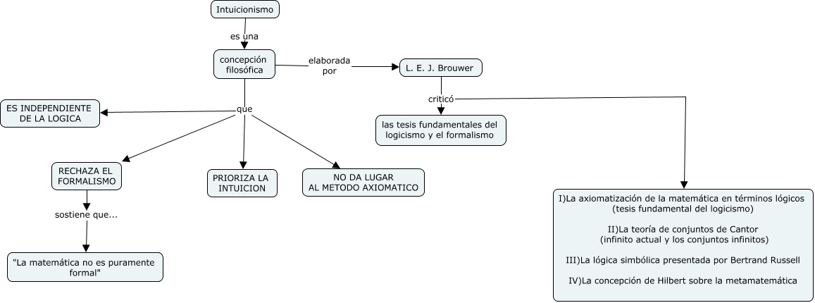 Este Cmap, tiene información relacionada con: INTUICIONISMO, concepción filosófica que PRIORIZA LA INTUICION, concepción filosófica elaborada por L. E. J. Brouwer, concepción filosófica que ES INDEPENDIENTE DE LA LOGICA, L. E. J. Brouwer criticó I) La axiomatización de la matemática en términos lógicos (tesis fundamental del logicismo) II) La teoría de conjuntos de Cantor (infinito actual y los conjuntos infinitos) III) La lógica simbólica presentada por Bertrand Russell IV) La concepción de Hilbert sobre la metamatemática, RECHAZA EL FORMALISMO sostiene que... "La matemática no es puramente formal", concepción filosófica que NO DA LUGAR AL METODO AXIOMATICO, L. E. J. Brouwer criticó las tesis fundamentales del logicismo y el formalismo, Intuicionismo es una concepción filosófica, concepción filosófica que RECHAZA EL FORMALISMO