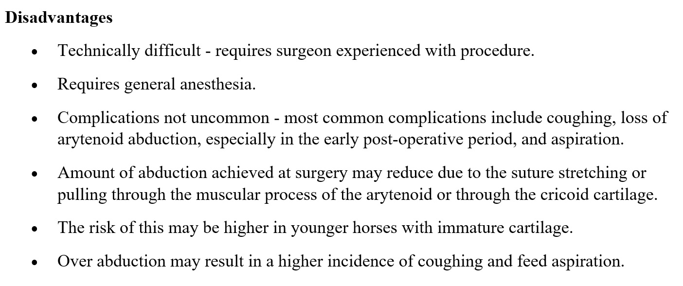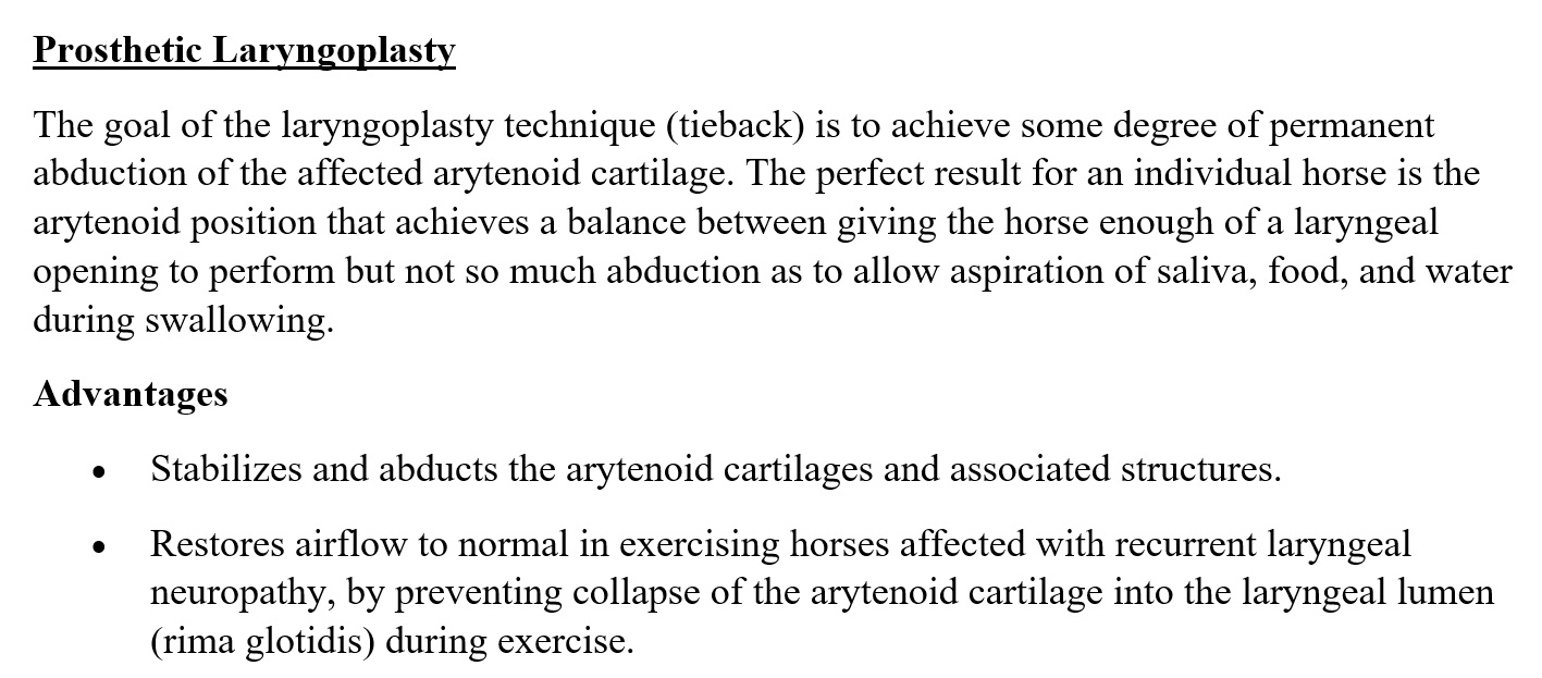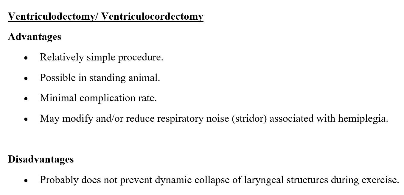 Advantages and Disadvantages of Ventriculocordectomy.jpg Advantages of Prosthetic Laryngoplasty.jpg Age.jpg ANATOMY OF THE LARYNX OF THE HORSE.pdf Choosing a Surgery to Treat Laryngeal Hemiplegia.jpg Clinical findings.png Copy of Pre and Post Op Larynghyoid Reduction and Pre VCE.cmap Copy of SVM 2018 Group 5 Lab 8.cmap Copy of SVM 2018 Group 5 Lab 8 1.cmap Copy of SVM 2018 Group 5 Lab 8 2.cmap Copy of SVM 2018 Group 5 Lab 8 3.cmap Copy of SVM 2018 Group 5 Lab 8 4.cmap DDSP.jpg DDSP during exercise.png DDSP in 2 yr old.png Disadvantages of Prosthetic Laryngoplasty.jpg donkey.jpg Donkey.cmap eqine history form.pdf EquineAnesthesia.pdf Equine Physical Examination.url Equipment for Prosthetic Laryngoplasty.jpg Etiology and Pathogenesis.png History, Physical Exam and Diagnosis .pdf horse 1.jpg horse 2.jpg Horse Joke!.png Indications for Surgery to Treat Laryngeal Hemiplegia.jpg Intraopp view of surgery 1.png Laryngeal Hemiplegia.cmap Laryngohyoid reduction.docx Laryngohyoid Reduction.cmap laryngoplasty.url Laryngoplasty procedure.docx Material Used In Surgery.jpg Normal soft palate Anatomy.jpg Post-op care for Ventriculocordectomy.docx Post Op Measures.png postop radiograph view.png Pre and Post Op Larynghyoid Reduction and Pre VCE.cmap Prevention of Laryngeal Hemiplegia.jpg PROCEDURE FOR VENTRICULECTOMY - VENTRICULOCORDECTOMY.pdf Risks and Considerations Involved in Ventriculodectomy - Ventriculocordectomy.jpg surgical instrument for laryngoplasty.docx surgical pk.jpg Techniques.png TECHNIQUES OF LARYNGEAL HEMIPLEGIA TREATMENT IN HORSES.pdf Tie-Back and Hobday Surgery Fact Sheet.pdf Tie back procedure.url Tie forward surgical equipment.docx URT Disease in Donkeys.jpg