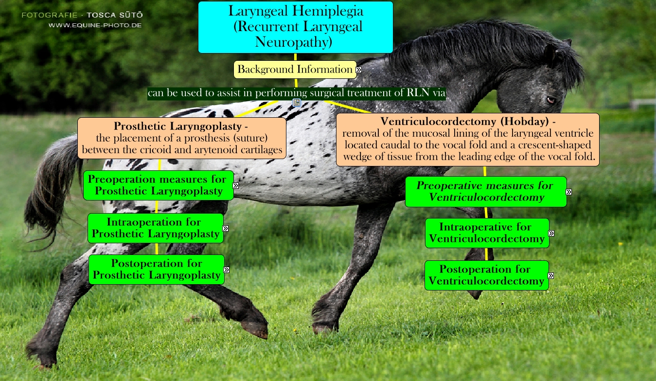 This Concept Map, created with IHMC CmapTools, has information related to: Laryngeal Hemiplegia, Preoperative Measures Anaesthesia drugs used in surgery, Preoperative Measures History (mouse over), Background Information can be used to assist in performing surgical treatment of RLN via Ventriculocordectomy (Hobday) - removal of the mucosal lining of the laryngeal ventricle located caudal to the vocal fold and a crescent-shaped wedge of tissue from the leading edge of the vocal fold., Preoperative Measures Equipment and Material Used (mouse over), Preoperative Measures Physical Examination, Intraoperative for Ventriculocordectomy Postoperation for Ventriculocordectomy, Ventriculocordectomy (Hobday) - removal of the mucosal lining of the laryngeal ventricle located caudal to the vocal fold and a crescent-shaped wedge of tissue from the leading edge of the vocal fold. Preoperative measures for Ventriculocordectomy, Prosthetic Laryngoplasty - the placement of a prosthesis (suture) between the cricoid and arytenoid cartilages Preoperation measures for Prosthetic Laryngoplasty, Preoperative Measures Anaesthesia Risks (mouse over), Intraoperation for Prosthetic Laryngoplasty Postoperation for Prosthetic Laryngoplasty, Laryngeal Hemiplegia (Recurrent Laryngeal Neuropathy) Background Information, Preoperative Measures Restaint and Safety (mouse over), Preoperative Measures Surgical Preparations (mouse over), Preoperative Measures Signalment (mouse over), Background Information can be used to assist in performing surgical treatment of RLN via Prosthetic Laryngoplasty - the placement of a prosthesis (suture) between the cricoid and arytenoid cartilages, Preoperative measures for Ventriculocordectomy Intraoperative for Ventriculocordectomy, Preoperation measures for Prosthetic Laryngoplasty Intraoperation for Prosthetic Laryngoplasty