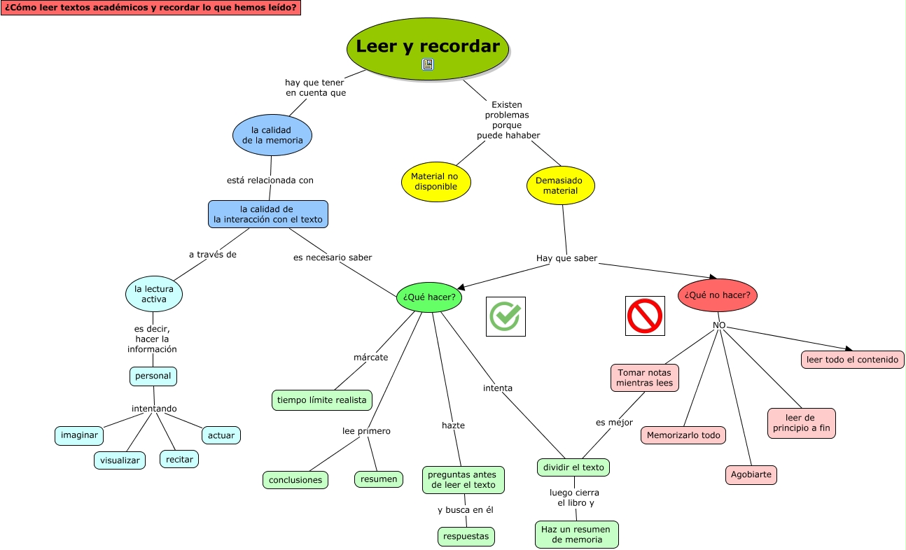 Este Cmap, tiene información relacionada con: Jesús Hernández Mesa, la calidad de la interacción con el texto a través de la lectura activa, Demasiado material Hay que saber ¿Qué hacer?, la calidad de la memoria está relacionada con la calidad de la interacción con el texto, Leer y recordar hay que tener en cuenta que la calidad de la memoria, Demasiado material Hay que saber ¿Qué no hacer?, ¿Qué hacer? intenta dividir el texto, ¿Qué no hacer? NO leer todo el contenido, preguntas antes de leer el texto y busca en él respuestas, ¿Qué no hacer? NO Tomar notas mientras lees, ¿Qué hacer? lee primero conclusiones, ¿Qué hacer? márcate tiempo límite realista, dividir el texto luego cierra el libro y Haz un resumen de memoria, ¿Qué no hacer? NO leer de principio a fin, personal intentando recitar, ¿Qué no hacer? NO Memorizarlo todo, ¿Qué hacer? hazte preguntas antes de leer el texto, la calidad de la interacción con el texto es necesario saber ¿Qué hacer?, personal intentando visualizar, Tomar notas mientras lees es mejor dividir el texto, personal intentando imaginar
