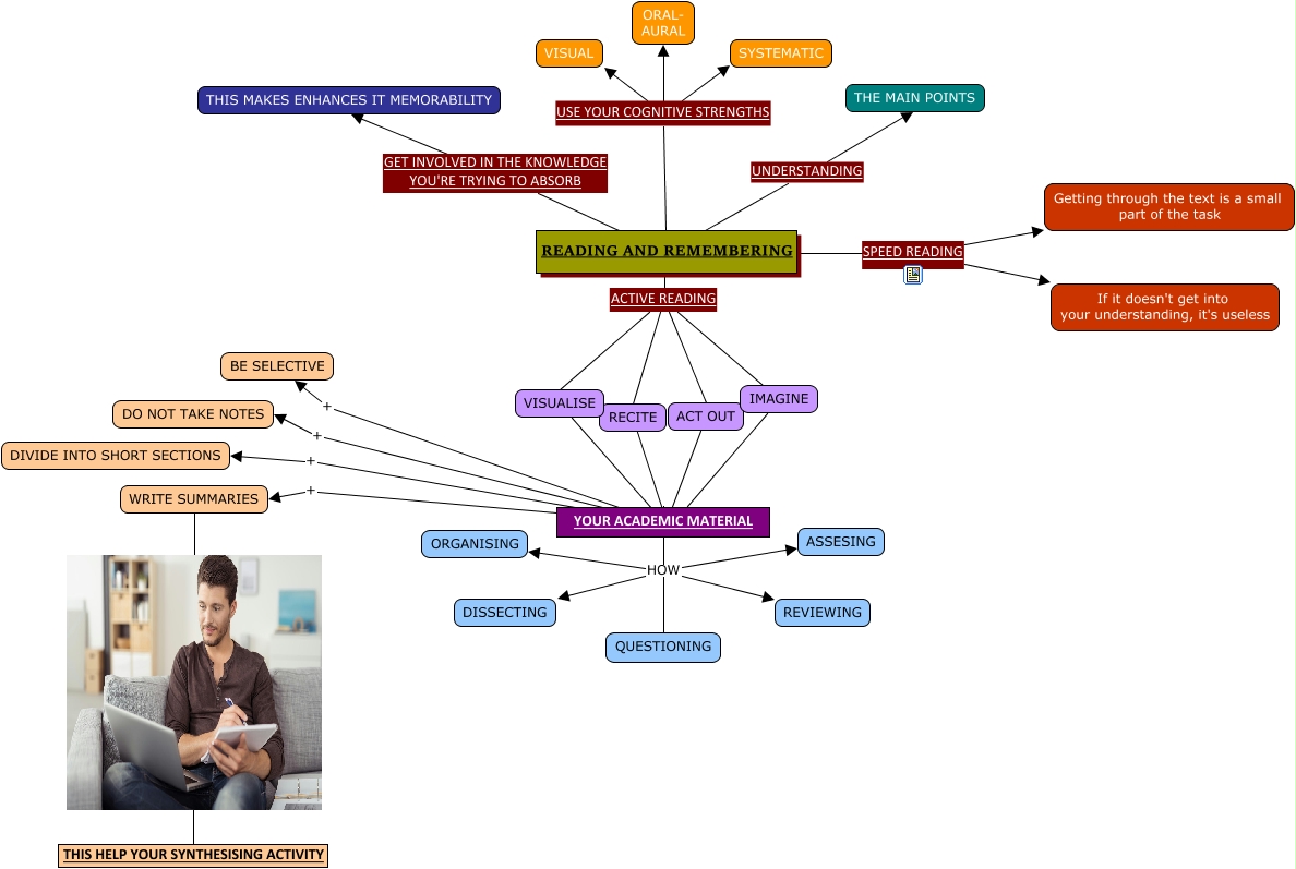 Este Cmap, tiene información relacionada con: MAPA CONCEPTUAL, YOUR ACADEMIC MATERIAL + DO NOT TAKE NOTES, YOUR ACADEMIC MATERIAL HOW ASSESING, YOUR ACADEMIC MATERIAL HOW QUESTIONING, YOUR ACADEMIC MATERIAL HOW REVIEWING, WRITE SUMMARIES THIS HELP YOUR SYNTHESISING ACTIVITY, RECITE ???? YOUR ACADEMIC MATERIAL, READING AND REMEMBERING ACTIVE READING RECITE, YOUR ACADEMIC MATERIAL + DIVIDE INTO SHORT SECTIONS, YOUR ACADEMIC MATERIAL HOW ORGANISING, YOUR ACADEMIC MATERIAL + WRITE SUMMARIES, READING AND REMEMBERING ACTIVE READING VISUALISE, READING AND REMEMBERING GET INVOLVED IN THE KNOWLEDGE YOU'RE TRYING TO ABSORB THIS MAKES ENHANCES IT MEMORABILITY, YOUR ACADEMIC MATERIAL HOW DISSECTING, IMAGINE ???? YOUR ACADEMIC MATERIAL, VISUALISE ? YOUR ACADEMIC MATERIAL, READING AND REMEMBERING ACTIVE READING ACT OUT, READING AND REMEMBERING SPEED READING Getting through the text is a small part of the task, READING AND REMEMBERING USE YOUR COGNITIVE STRENGTHS ORAL- AURAL, YOUR ACADEMIC MATERIAL + BE SELECTIVE, ACT OUT ???? YOUR ACADEMIC MATERIAL