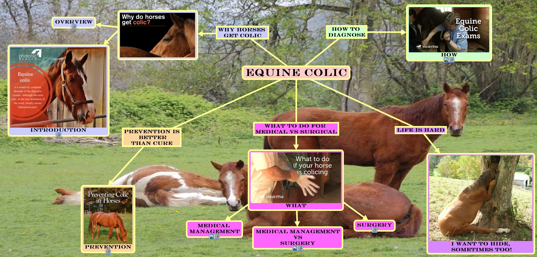 This Concept Map, created with IHMC CmapTools, has information related to: Lab 9 Equine Colic, Equine Colic why horses get colic Why, Equine Colic what to do for medical vs surgical What, Why ???? Overview, What ???? Surgery, Equine Colic how to diagnose How, Equine Colic prevention is better than cure Prevention, Why ???? Introduction, What ???? Medical Management, What ???? Medical Management vs Surgery, Equine Colic life is hard I want to hide, sometimes too!