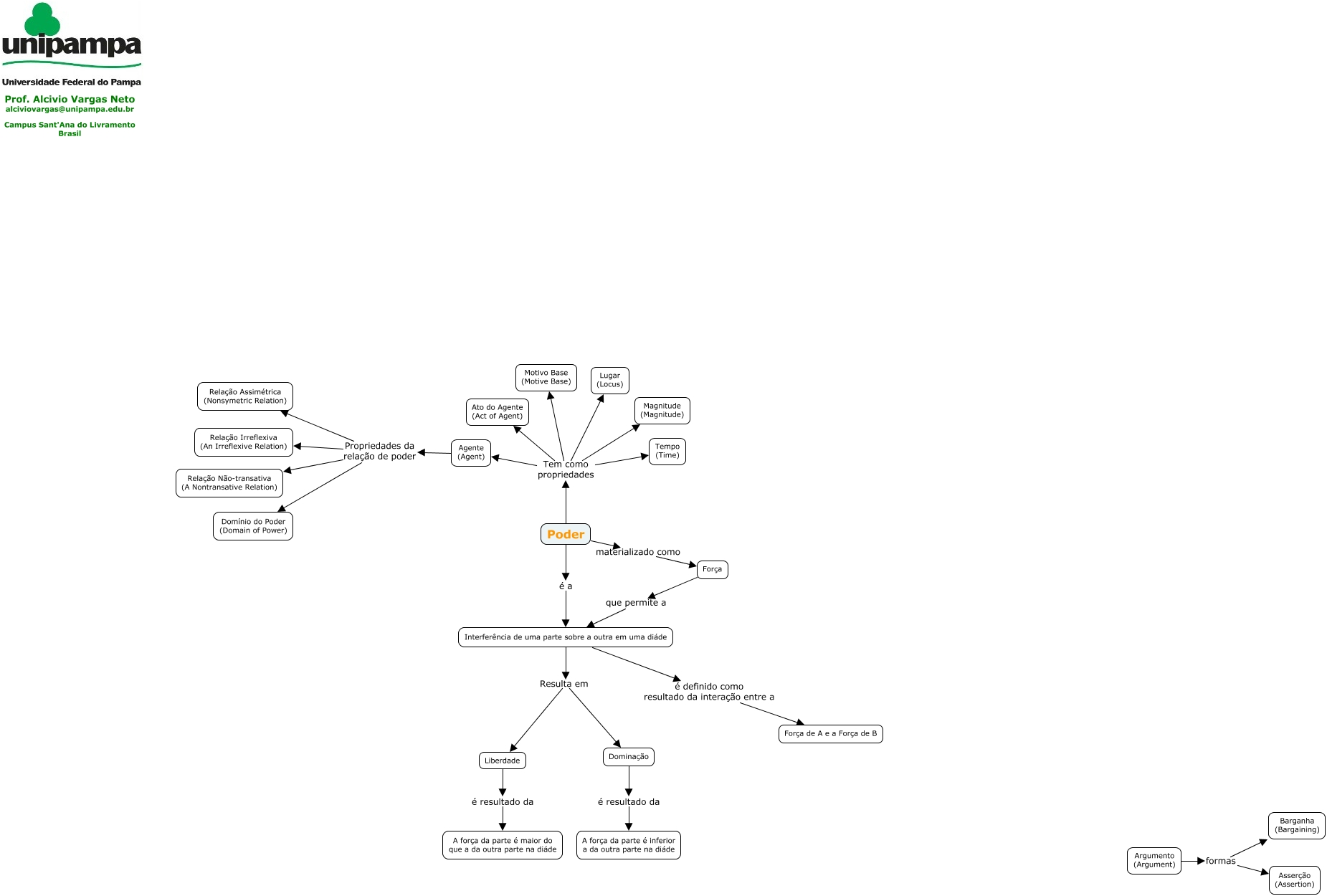 Esse mapa conceitual, produzido no IHMC CmapTools, tem a informação relacionada a: Poder, Argumento (Argument) formas Asserção (Assertion), Poder Tem como propriedades Lugar (Locus), Interferência de uma parte sobre a outra em uma diáde Resulta em Liberdade, Poder Tem como propriedades Ato do Agente (Act of Agent), Liberdade é resultado da A força da parte é maior do que a da outra parte na diáde, Agente (Agent) Propriedades da relação de poder Relação Não-transativa (A Nontransative Relation), Interferência de uma parte sobre a outra em uma diáde Resulta em Dominação, Força que permite a Interferência de uma parte sobre a outra em uma diáde, Argumento (Argument) formas Barganha (Bargaining), Poder Tem como propriedades Agente (Agent), Dominação é resultado da A força da parte é inferior a da outra parte na diáde, Poder materializado como Força, Poder Tem como propriedades Magnitude (Magnitude), Agente (Agent) Propriedades da relação de poder Relação Irreflexiva (An Irreflexive Relation), Poder é a Interferência de uma parte sobre a outra em uma diáde, Poder Tem como propriedades Motivo Base (Motive Base), Agente (Agent) Propriedades da relação de poder Relação Assimétrica (Nonsymetric Relation), Poder Tem como propriedades Tempo (Time), Interferência de uma parte sobre a outra em uma diáde é definido como resultado da interação entre a Força de A e a Força de B, Agente (Agent) Propriedades da relação de poder Domínio do Poder (Domain of Power)